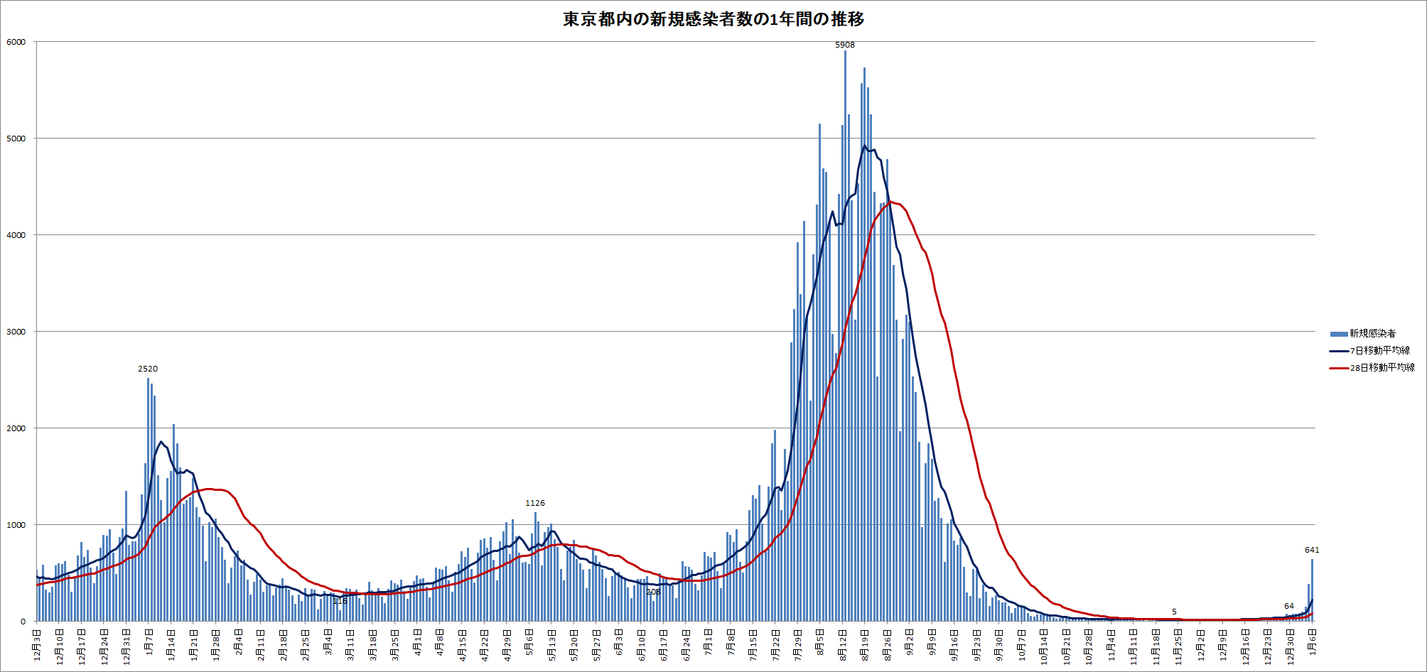 東京都内の1日あたりの新規感染者数の1年間の推移をグラフ化すると以下のようになる。
