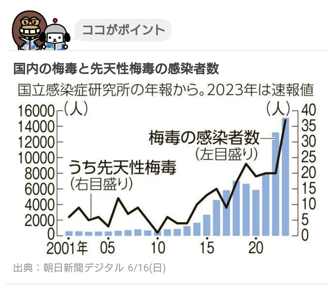 若い女性にも感染が広がっており、胎児に感染する「先天性梅毒」も急増している。