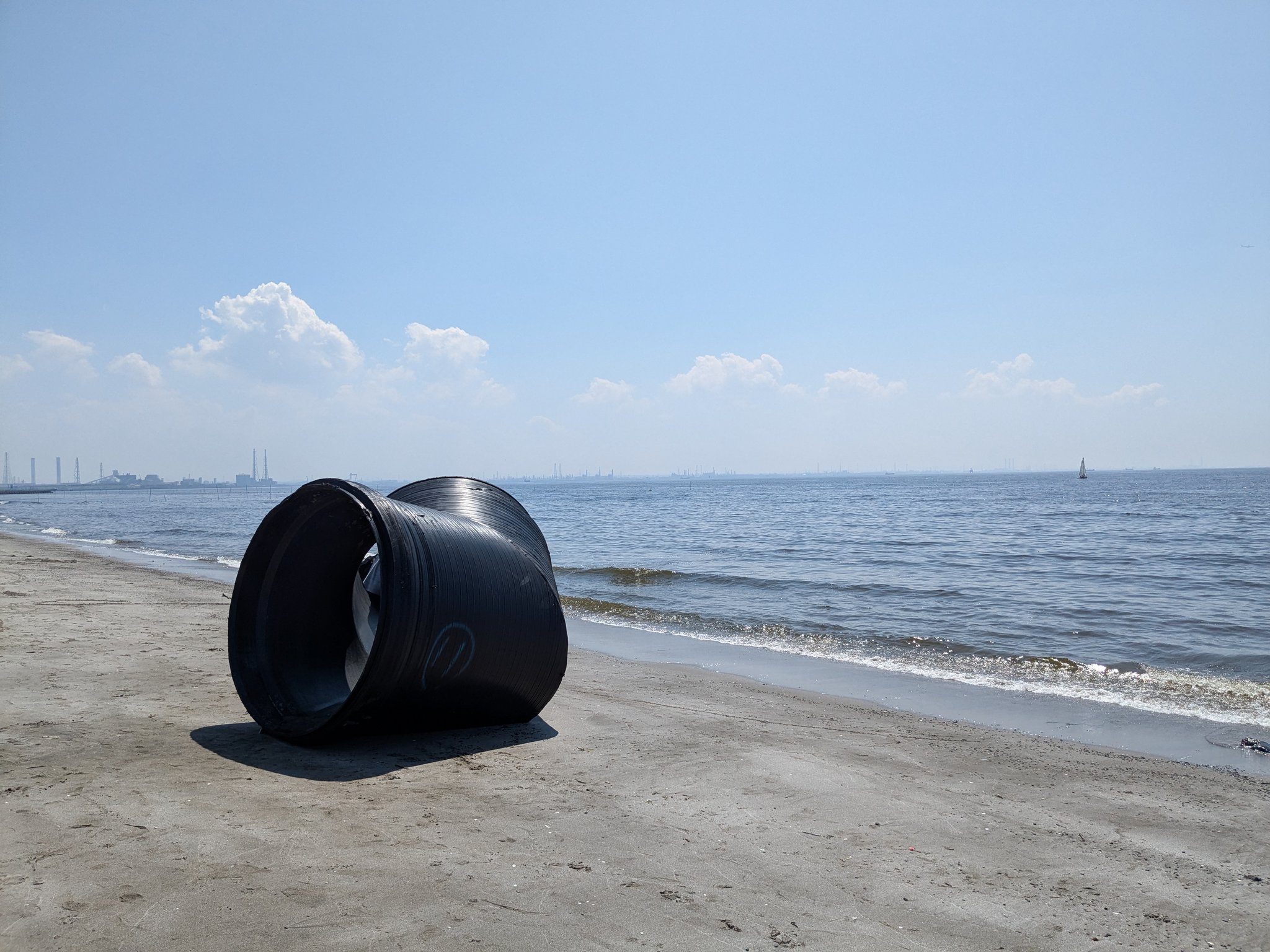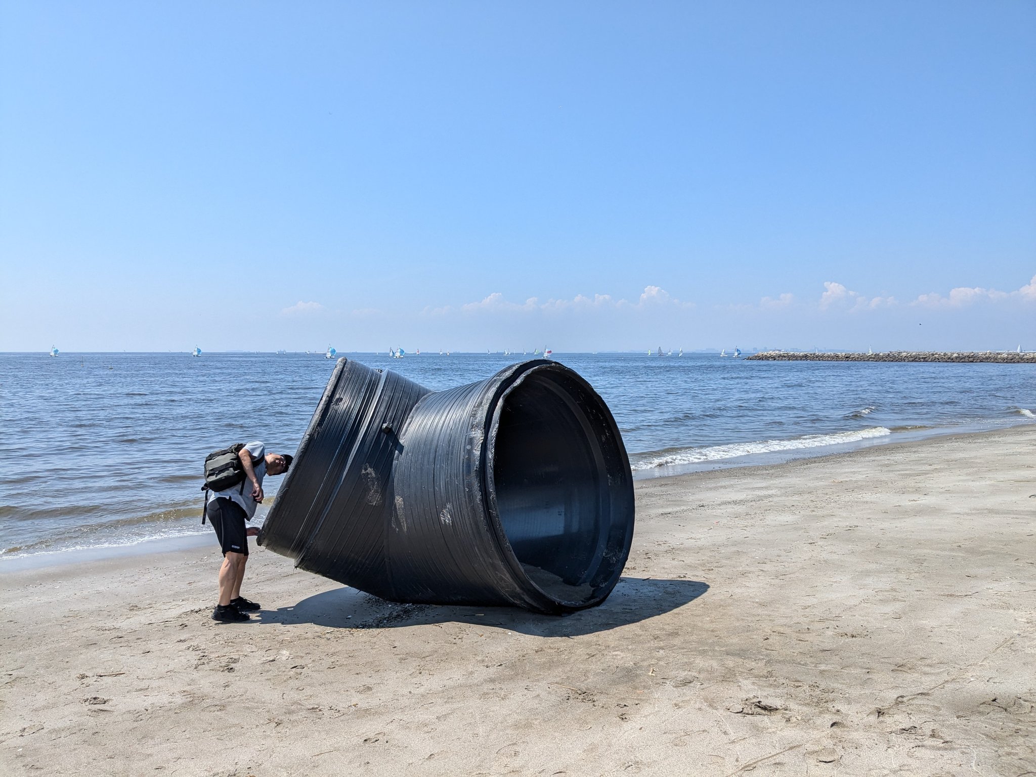 稲毛の浜にドデカい漂着物が流れ着いてる。