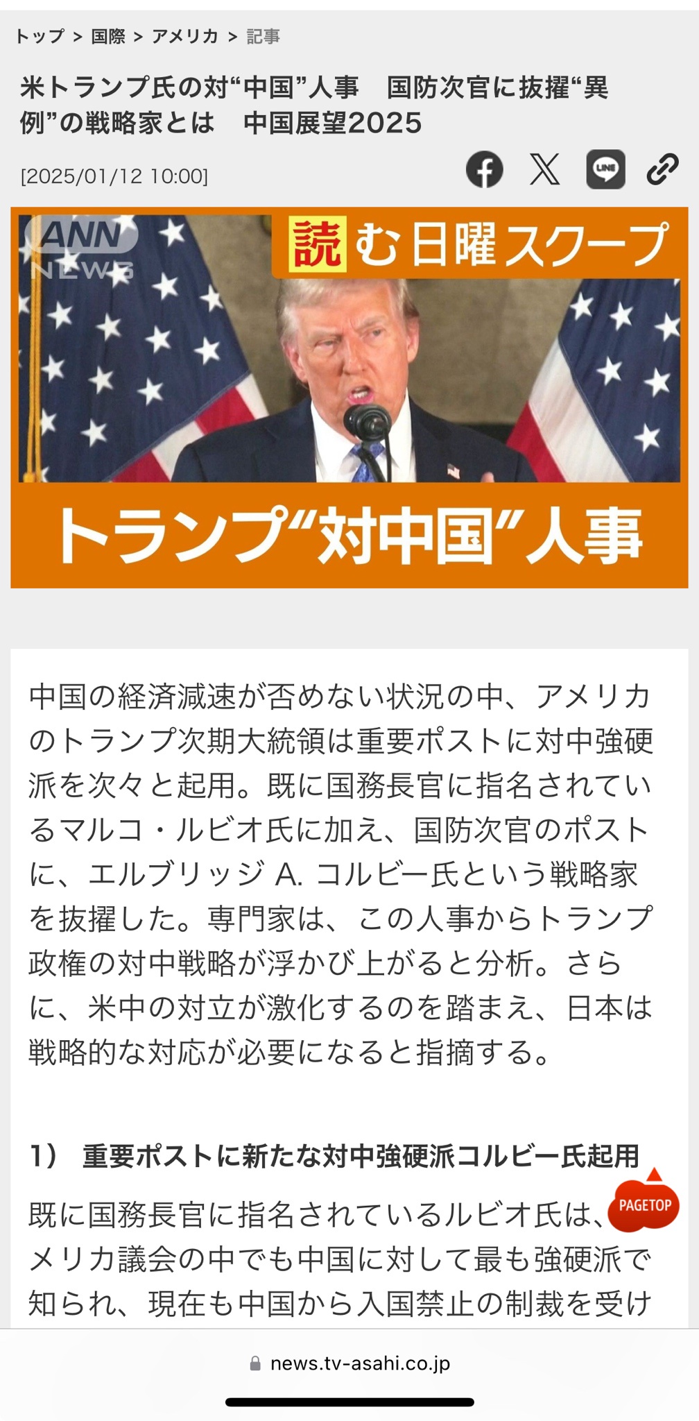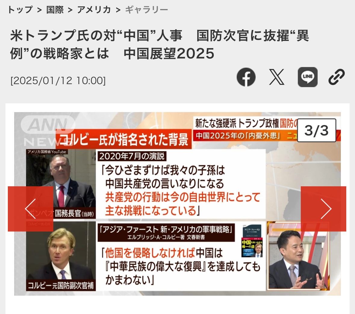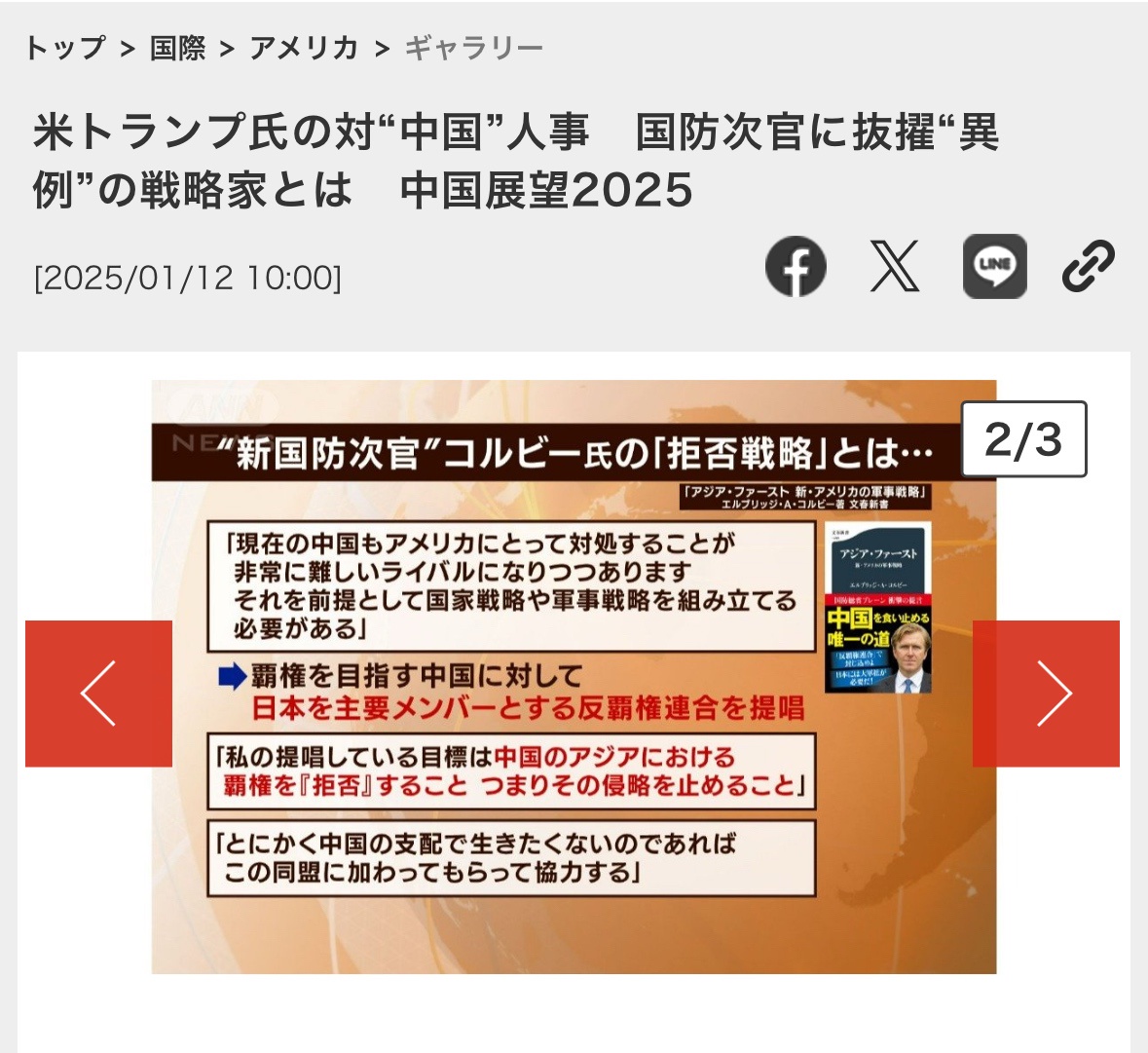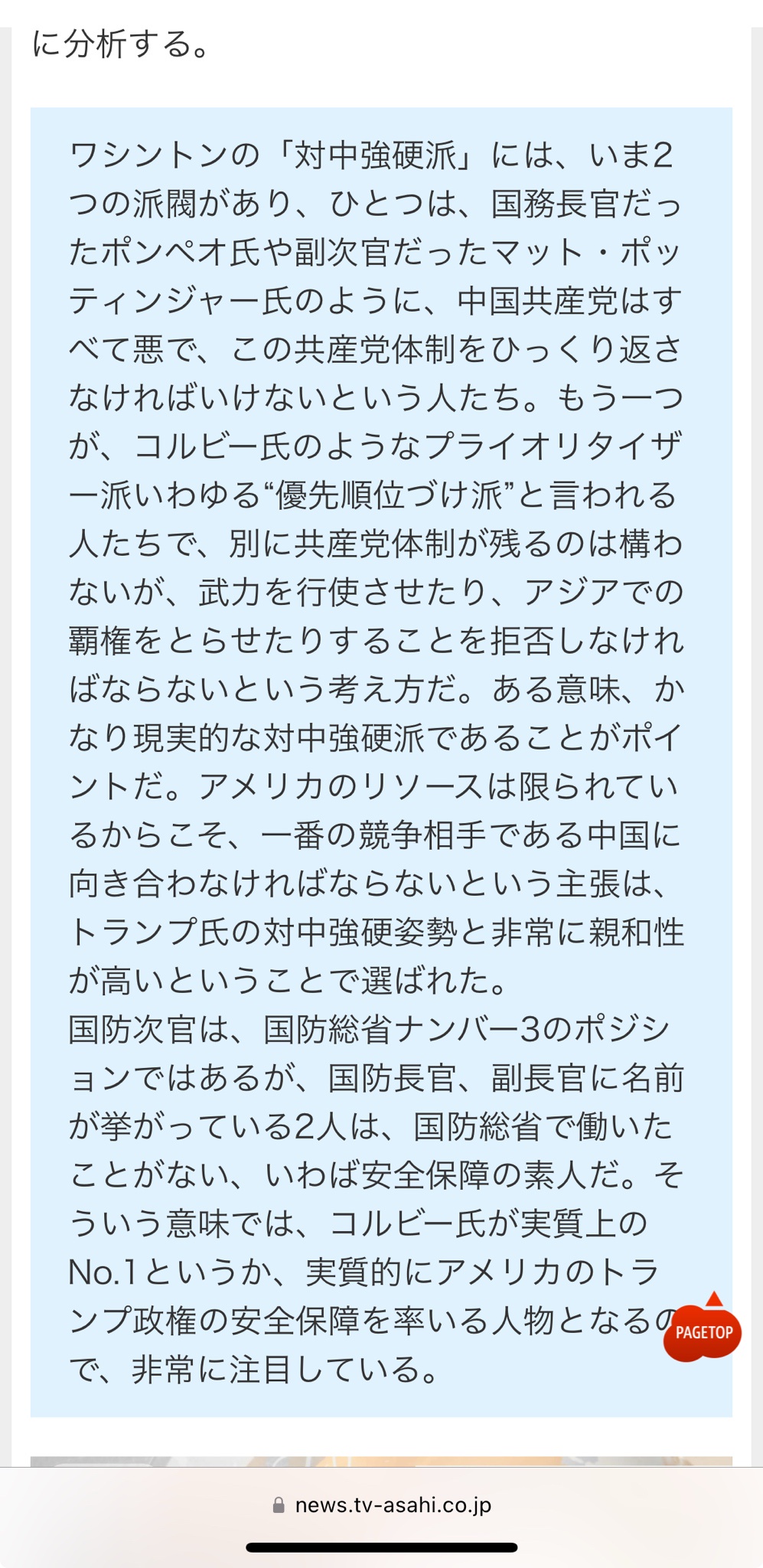 >ワシントンの「対中強硬派」には、いま2つの派閥があり、ひとつは、国務長官だったポンペオ氏や副次官だったマット・ポッティンジャー氏のように、中国共産党はすべて悪で、この共産党体制をひっくり返さなければいけないという人たち。もう一つが、コルビー氏のようなプライオリタイザー派いわゆる“優先順位づけ派”と言われる人たちで、別に共産党体制が残るのは構わないが、武力を行使させたり、アジアでの覇権をとらせたりすることを拒否しなければならないという考え方だ。