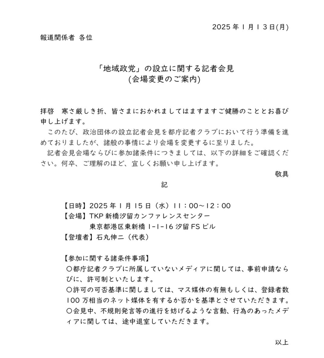 【画像】石丸伸二政党の記者会見、参加要件がヤバすぎるwww「オールドメディアは100万人登録者数のみ!批判発言は退場!」