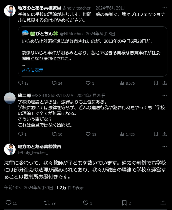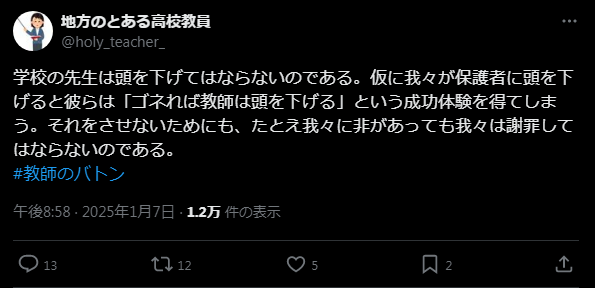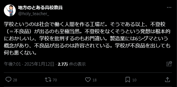現役教師、超正論。「一般人が教師を批判することは許されない」「教師はたとえ非があっても謝罪してはならない」「不登校児は不良品」