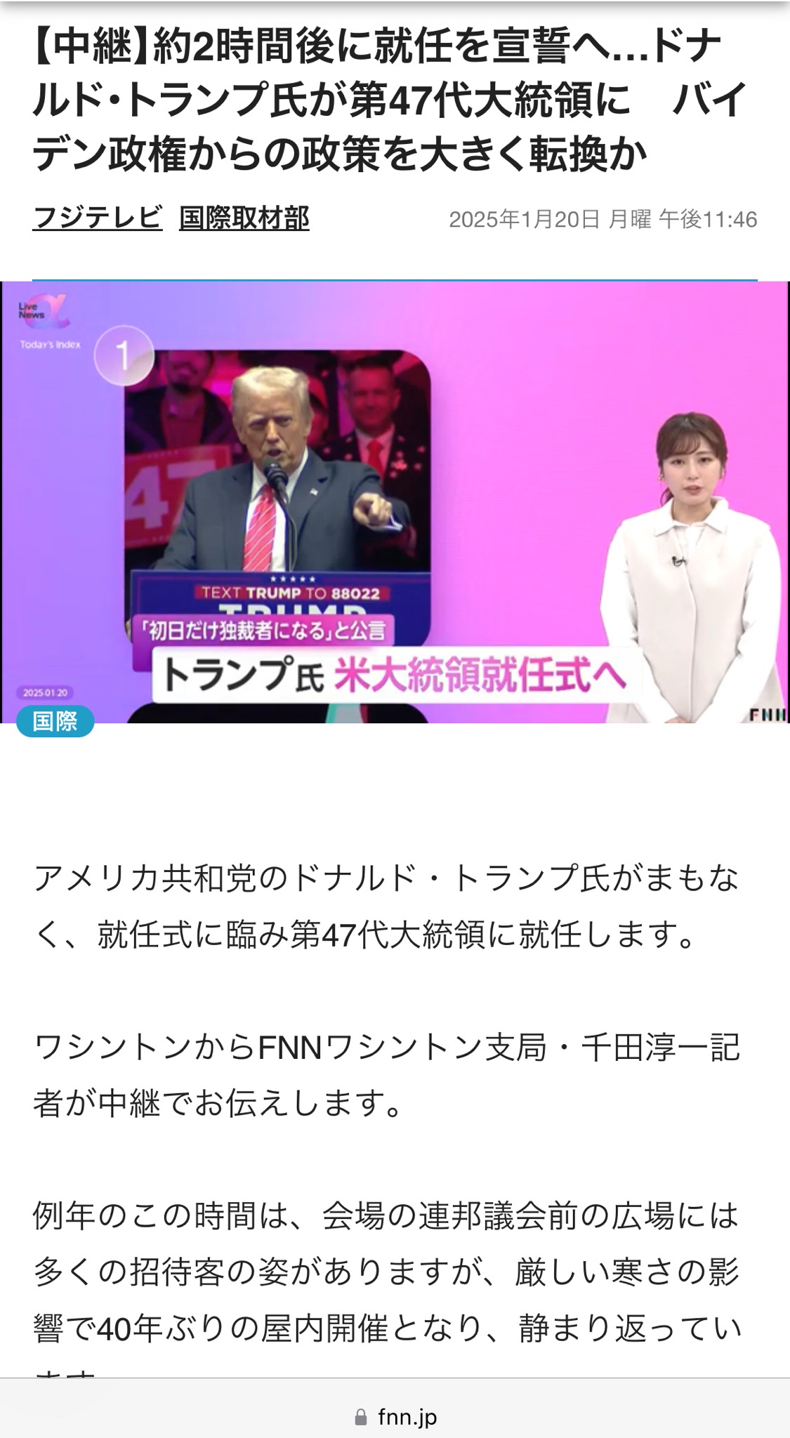 「今日、われわれは単に政権から政権に権力を移譲するわけではない。われわれは、ワシントンから人民へと権力を戻すのだ」 - 20 名前:一般よりも上級の名無しさん 投稿日時:2025/01/21(火) 00:06:10.07 ID:Gu/7NpHe0