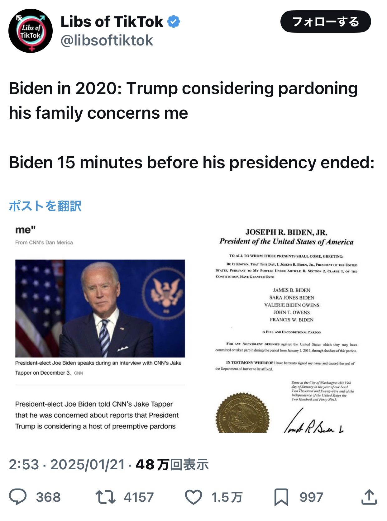バイデン「おい俺の任期残りどんぐらい?15分!?よし、俺の親戚全員無罪!あと知らねーwww」