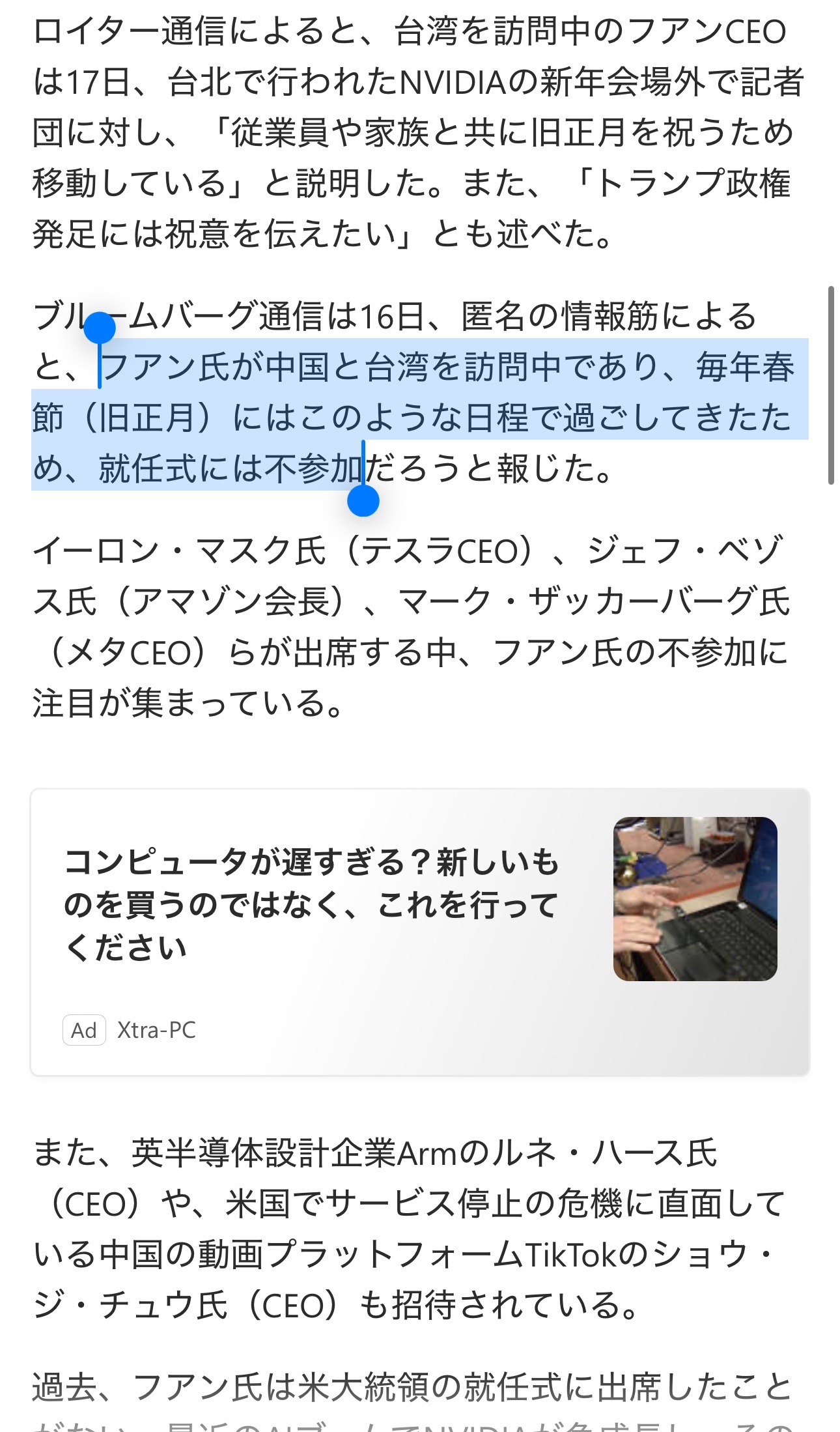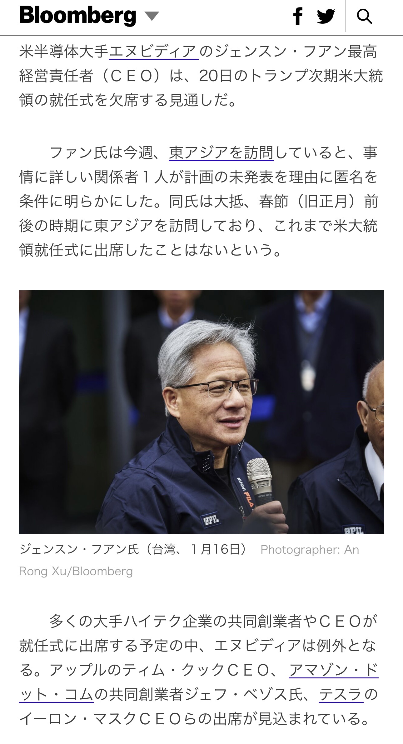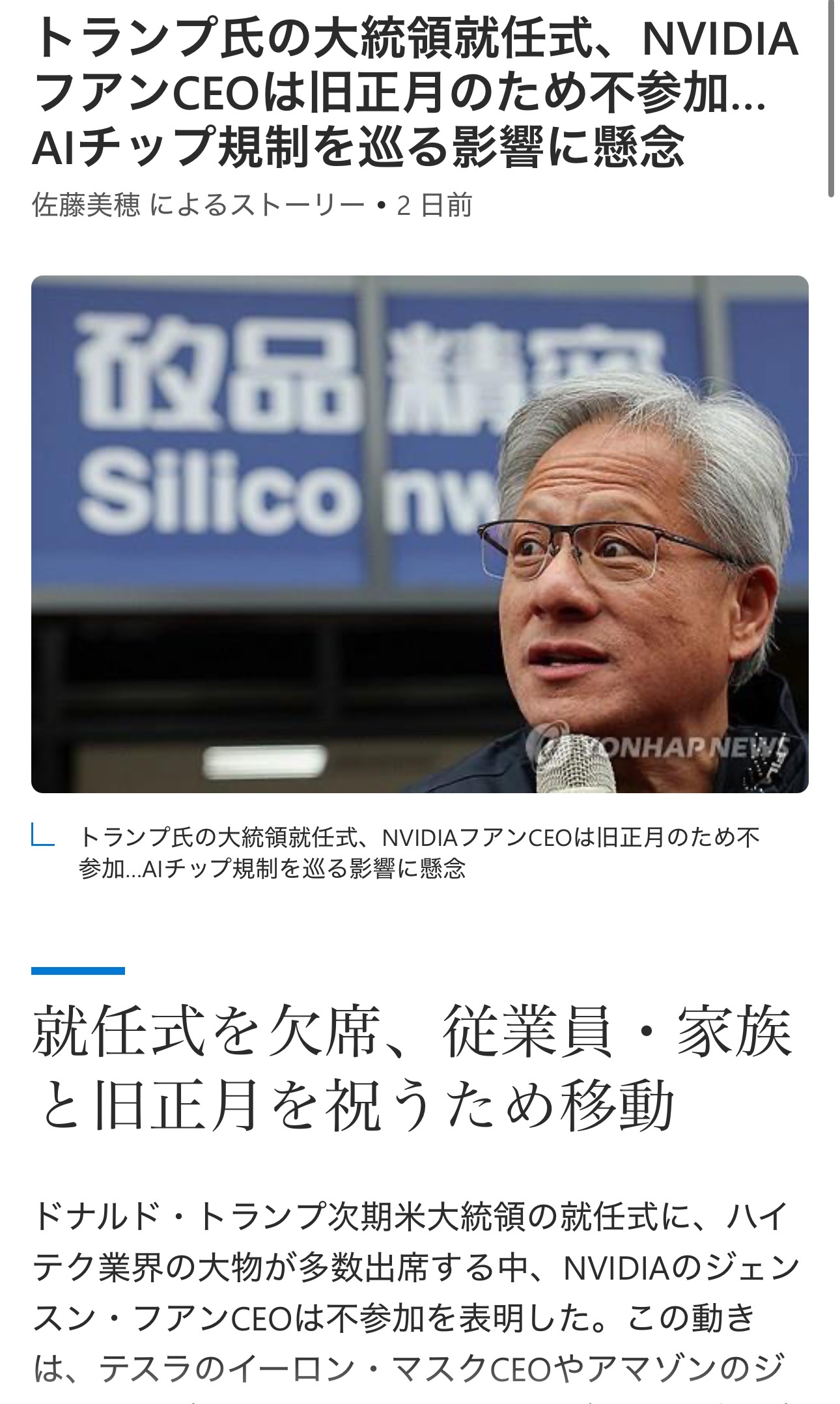 NVIDIAの革ジャンさん、旧正月を中国で親族などと祝うためトランプ就任式を欠席していたwwwwwwwwwwwwwwwwwww