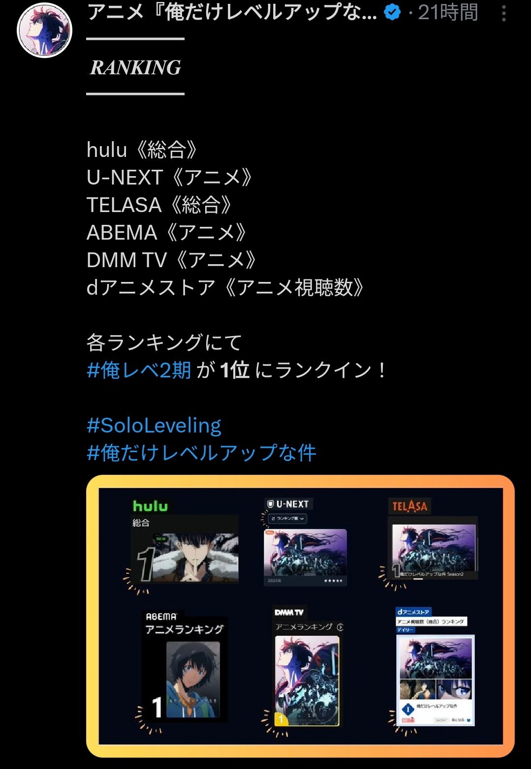 韓国アニメ「俺だけレベルアップな件2期」主要配信サイト全てで1位を獲得してしまうwww
