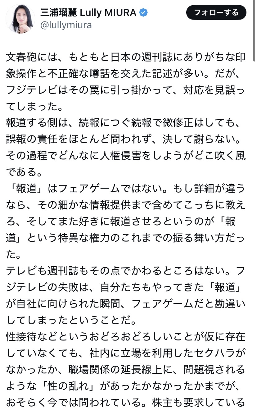 三浦瑠璃さん勝ち馬に乗ろうとしてフジテレビを批判するも速攻で論破される…