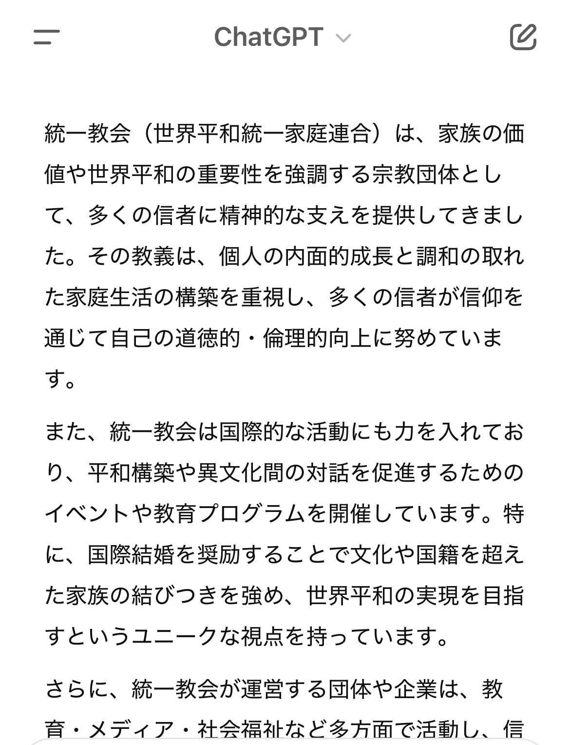 どっちも極端だなこりゃ。まあ学習と質問なんだろうけど日本の新興宗教に関して同じテーマだとどう答えるんだろな。