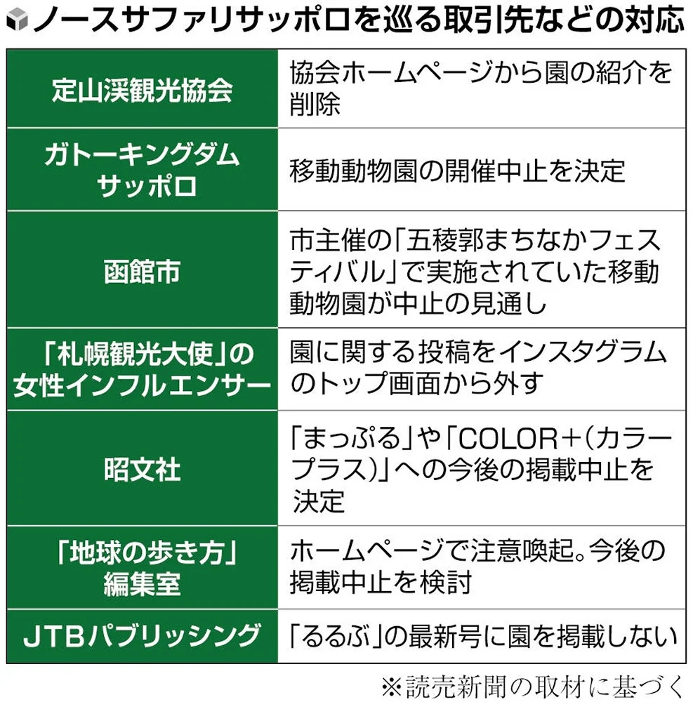 https://www.yomiuri.co.jp/national/20250222-OYT1T50045/札幌市南区の市街化調整区域で民間動物園「ノースサファリサッポロ」が市の開発許可を得ずに20年近く営業していた問題は、運営会社「サクセス観光」の取引先など多方面に影響を及ぼしている。定山渓エリア有数の観光スポットに成長した同園だが、コンプライアンス(法令順守)の観点から距離を置こうとする企業・団体が後を絶たない。