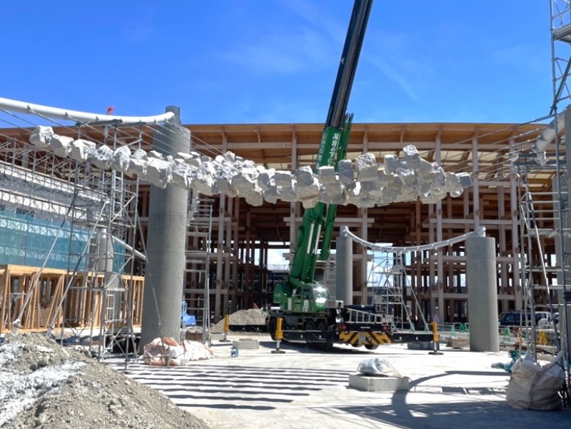 工藤氏は植物ではなく石を用いて、1855m2ある休憩所2の敷地を覆う。石のパーゴラは高い所で約9.5mと見上げるほどだ。つるす石の総重量は約90トンに及ぶ。