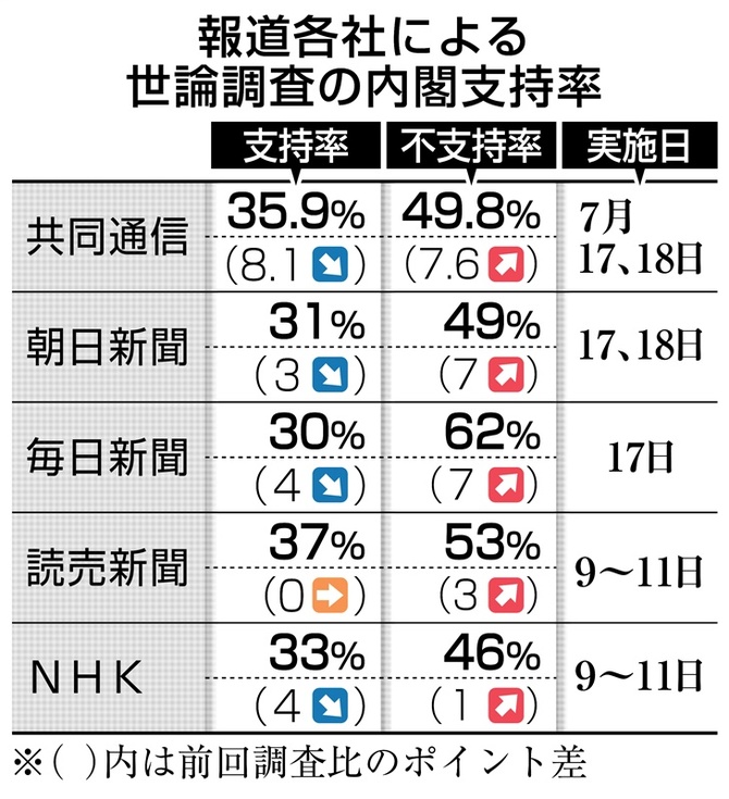 内閣と自民の支持率の下げと