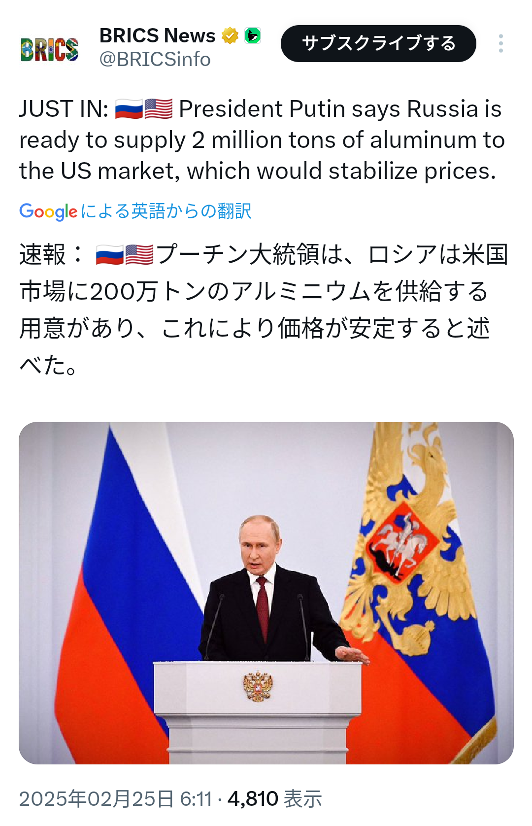 ロシアが米国にアルミを売るって話だよw - 4 名前:一般よりも上級の名無しさん 投稿日時:2025/02/25(火) 06:24:50.08 ID:r+pGCq1p0