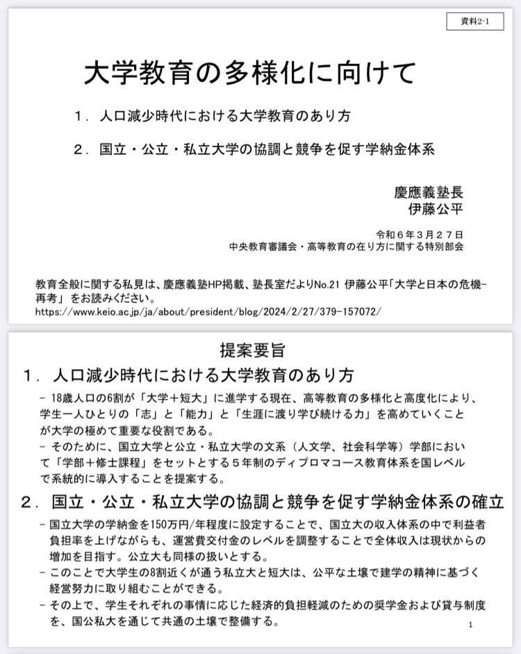 訂正:当初「特に、国立大学の授業料を現在の3倍、150万円にすべき」と記載してしたところ、「中央教育審議会の特別部会では、委員の1人である慶應義塾の伊藤公平塾長より、国立大学の授業料を現在の3倍、150万円にすべき」と変更したしました。(2025年2月27日)