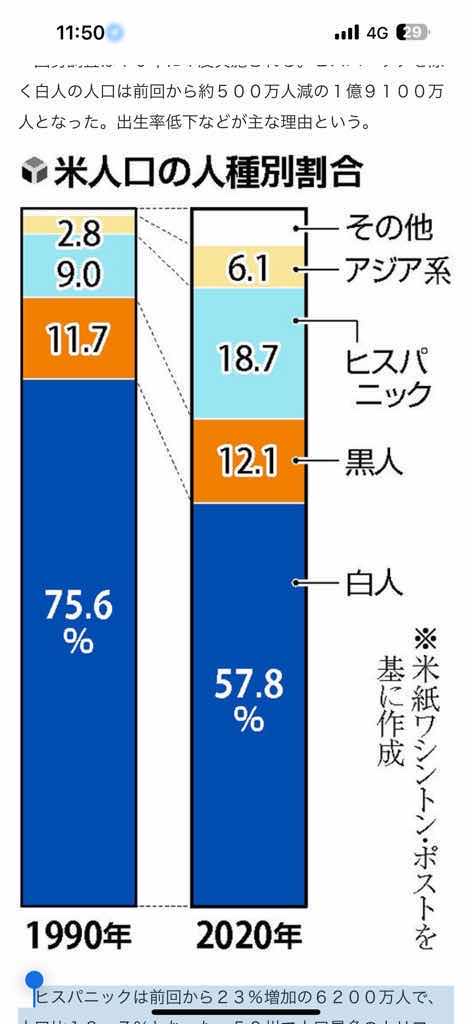 テキサスはもう現時点で全州民の過半数がヒスだよ白人は僅差で2番手