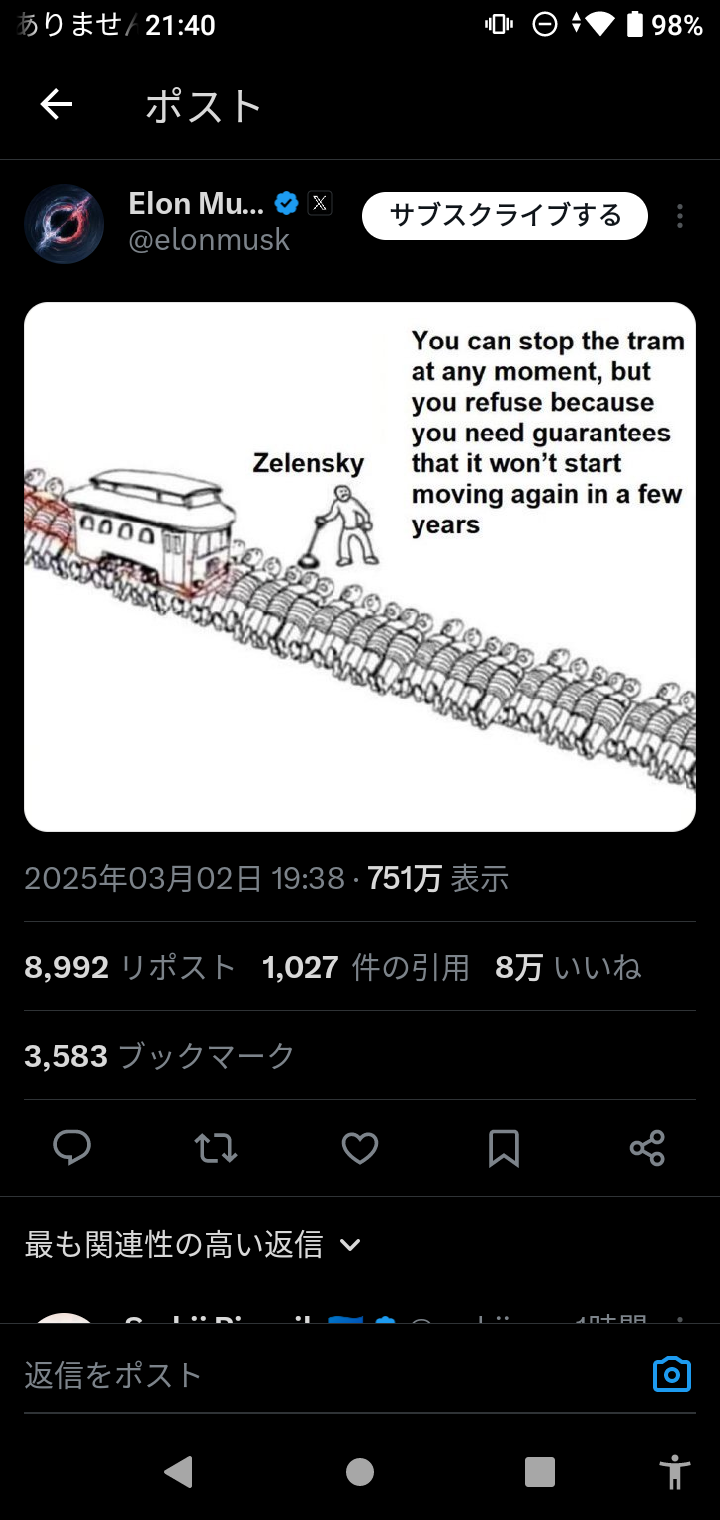 ゼレンスキーが停止スイッチを押さないって意味か - 33 名前:一般よりも上級の名無しさん 投稿日時:2025/03/02(日) 22:39:34.89 ID:EtK9X3/t0