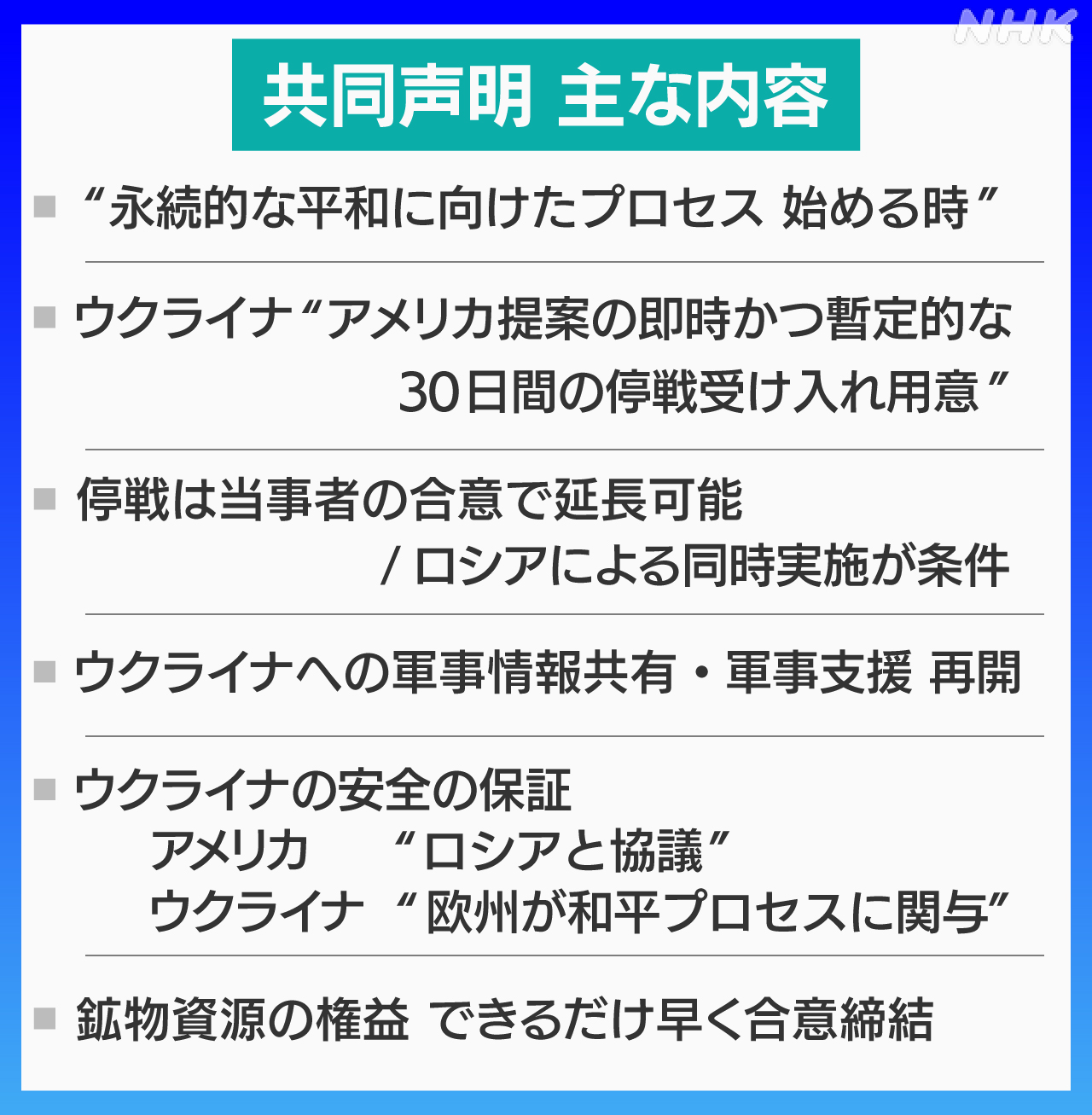 協議のあとゼレンスキー大統領はSNSで、30日間の停戦についてすべての前線で完全な停戦を行う提案がアメリカ側からあったとしたうえで「ウクライナは平和の用意がある。ロシアが戦争を終わらせるのか、続けるのかを明らかにしなくてはならない」と述べ、停戦が実現するかどうかはロシアの出方しだいだと強調しました。