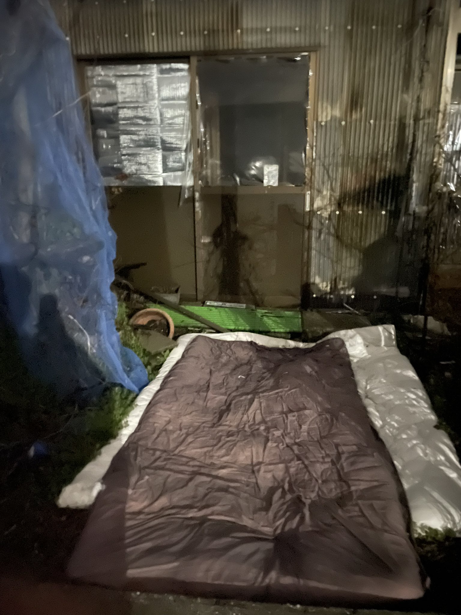 サンルームの周りは土なので布団を置いて草木が生えないようにしている