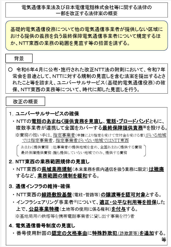 改正案では、電話サービスの基礎的電気通信役務について、指定事業者がいる地域ではその事業者が、指定事業者がいない地域ではNTT東西が提供する義務を負う。指定事業者は交付金を受けてサービスを提供でき、この指定事業者がいる場合、NTT(持株・東西)は日本全国で電話サービスを提供する義務がなくなる。この他、NTT東西の業務範囲見直し、NTT東西の電柱・管路などの譲渡等を認可対象とすることなども盛り込まれている。