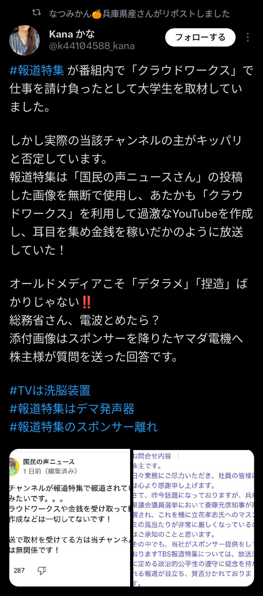 報道特集「チャンネル主がクラウドワークス使って立花の切り抜き拡散している!」捏造か、チャンネル主が全否定