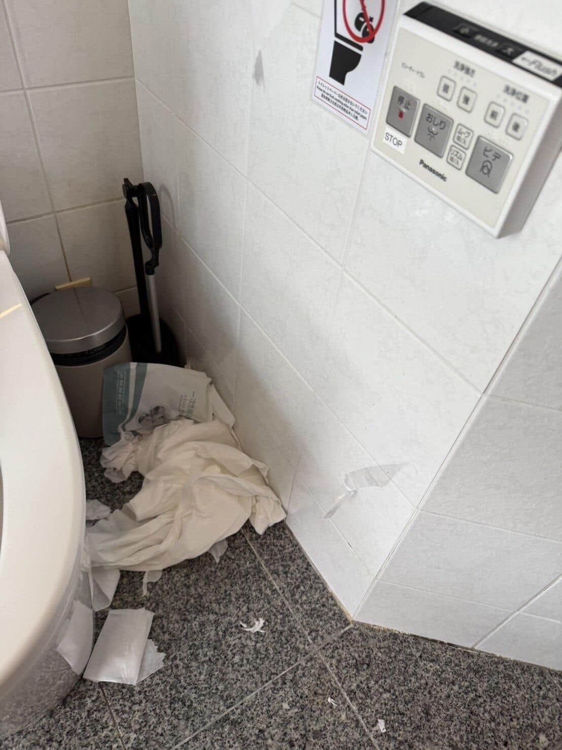 他の写真もアップしており、それらを見ると、トイレの床にトイレットペーパーが散らばり、洗面台の上にも汚れたタオルやヒゲソリ、使用済み化粧品などが放置してあった。