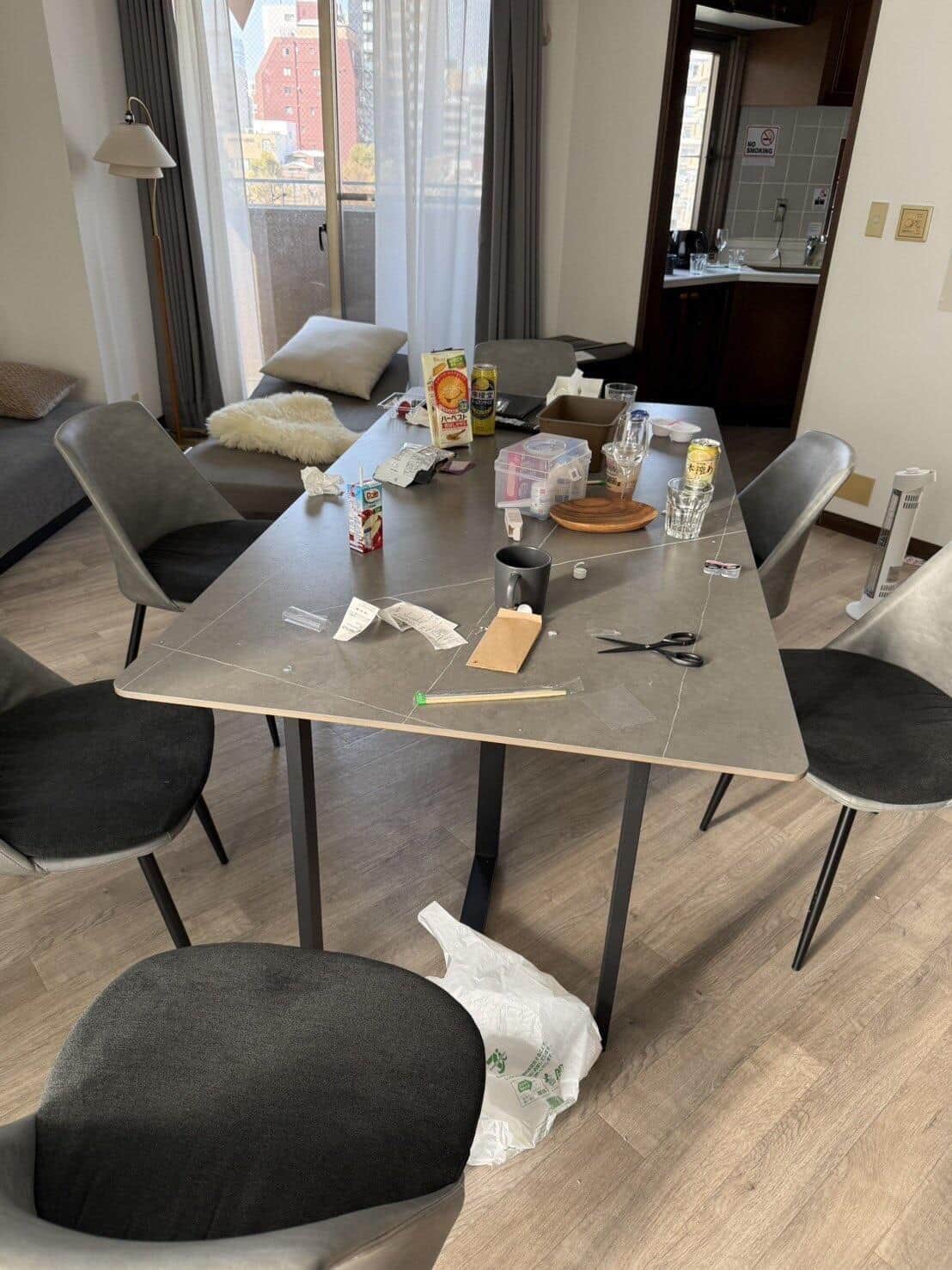 テーブルの上に、チュウハイの空き缶やレシート、チリ紙などが散乱し、イスも無造作に置かれている。