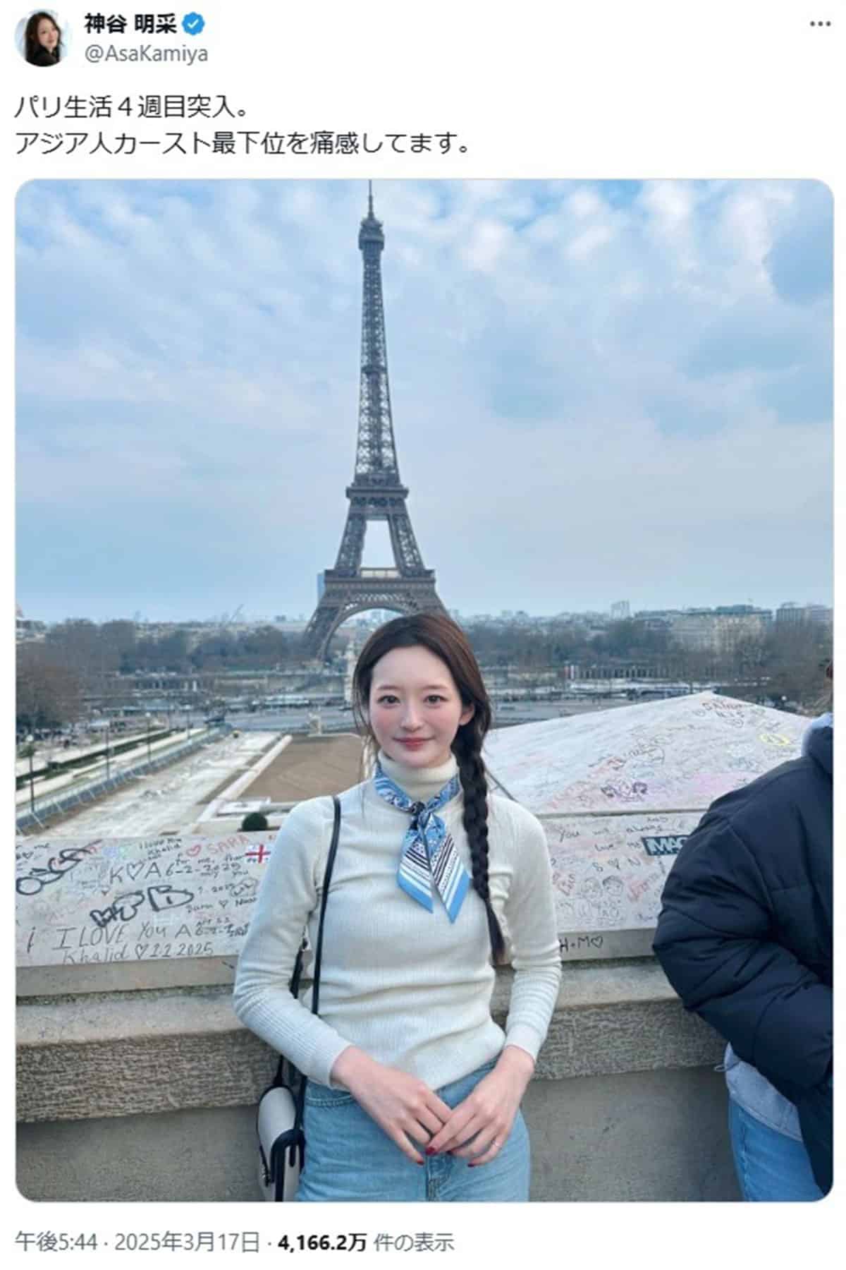 「神谷さんは、2020年の『ミス東大』という肩書をひっさげて芸能界入りし、モデルやタレントとして活躍しています。現在は東京大学公共政策大学院で学んでおり、2025年9月からはパリのビジネススクール『HEC』に進学予定だそう。すでにパリで生活しているようです。しかし、現地で差別を体験したようで、3月17日にXでエッフェル塔をバックにした写真とともに