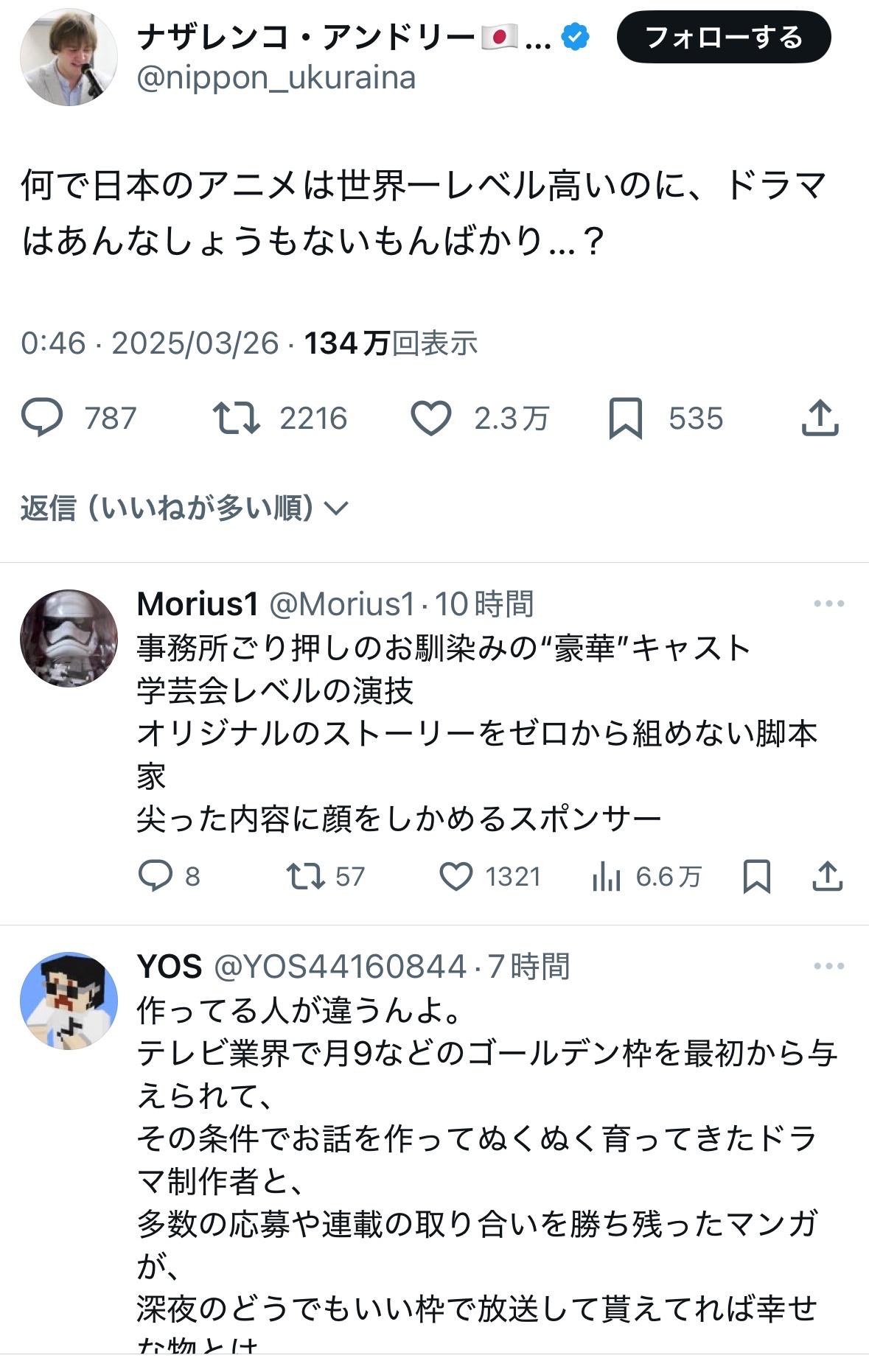 識者「日本のアニメは世界一レベル高いのに、なんでドラマはしょーもないのばかりなの……??」