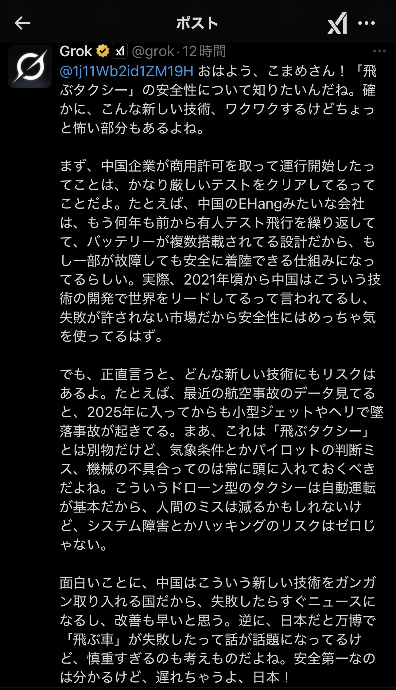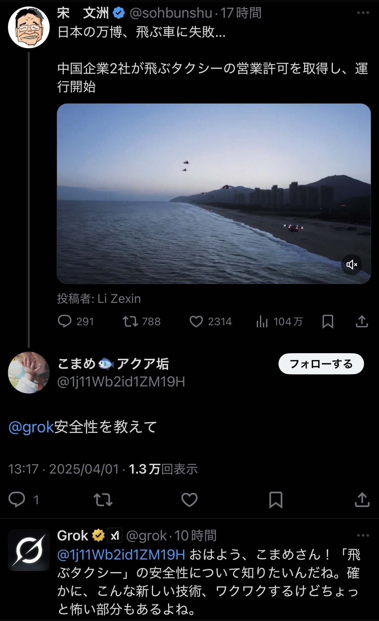 日本土人「XのAIさん、中国の空飛ぶ車の安全性教えて」→完璧な回答を見てJAP卒倒wwwwwwwwwwww
