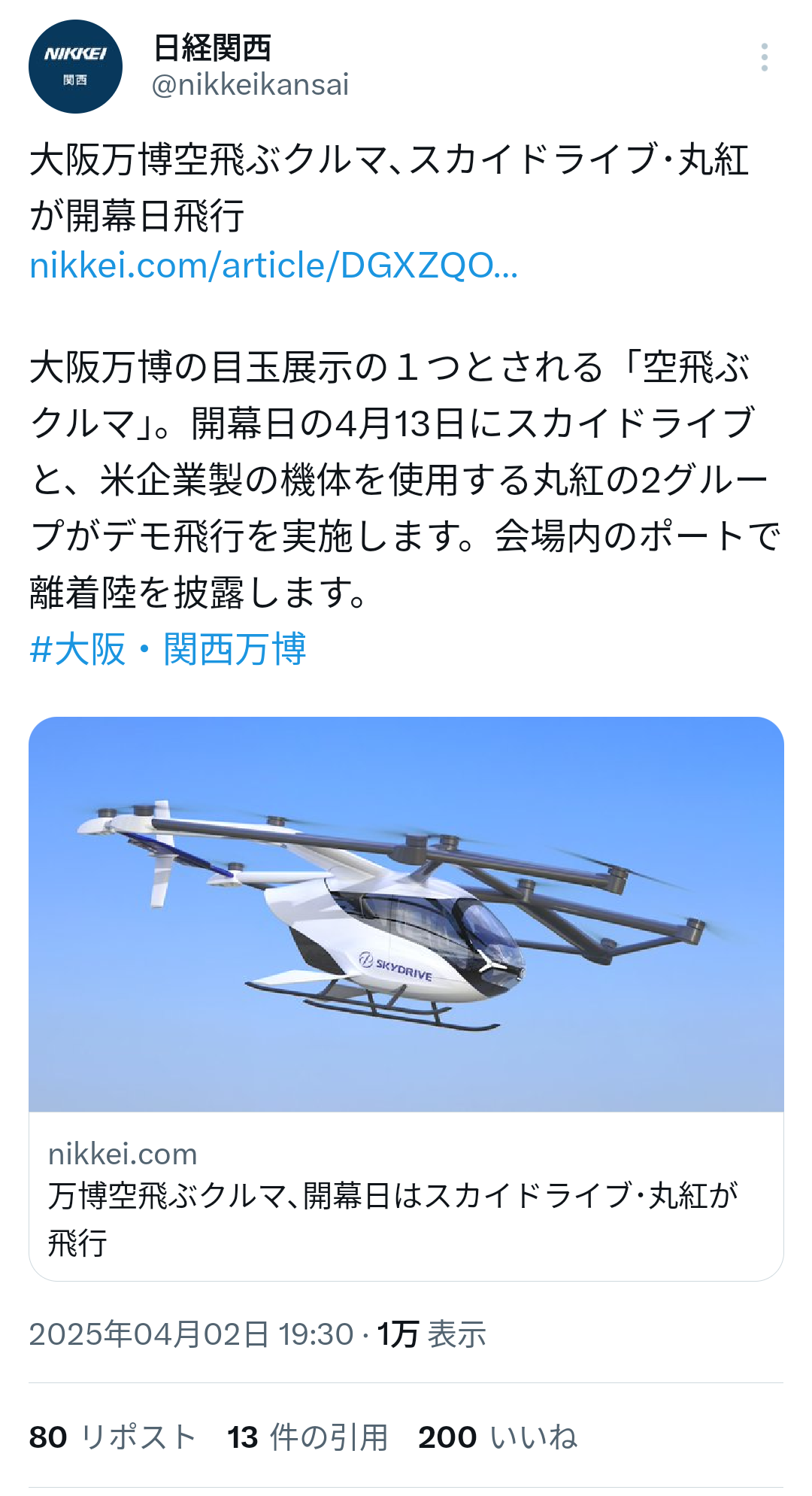 「飛んだ!飛んだ!空飛ぶクルマが飛びました!!!!歴史的快挙です!!!これが大阪万博です!!!!」 - 37 名前:一般よりも上級の名無しさん 投稿日時:2025/04/03(木) 12:33:38.08 ID:PdJu8ahB0