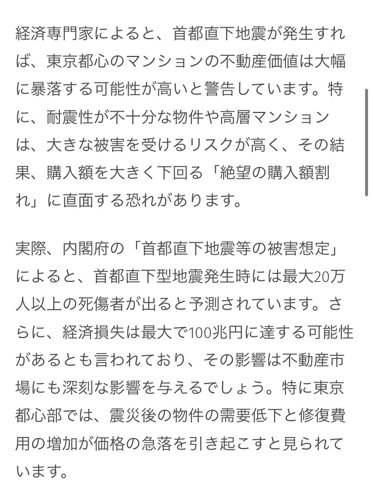 また、データによると、首都圏では過去の震災後、物件価格が最大30~40%下落した事例もあります。このため、現在高騰している都心の不動産市場でも、震災後には同様の価格下落が予想され、購入者は大きな資産損失を避けるためにリスク管理を強化する必要があると専門家は指摘しています。