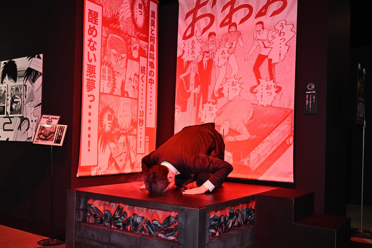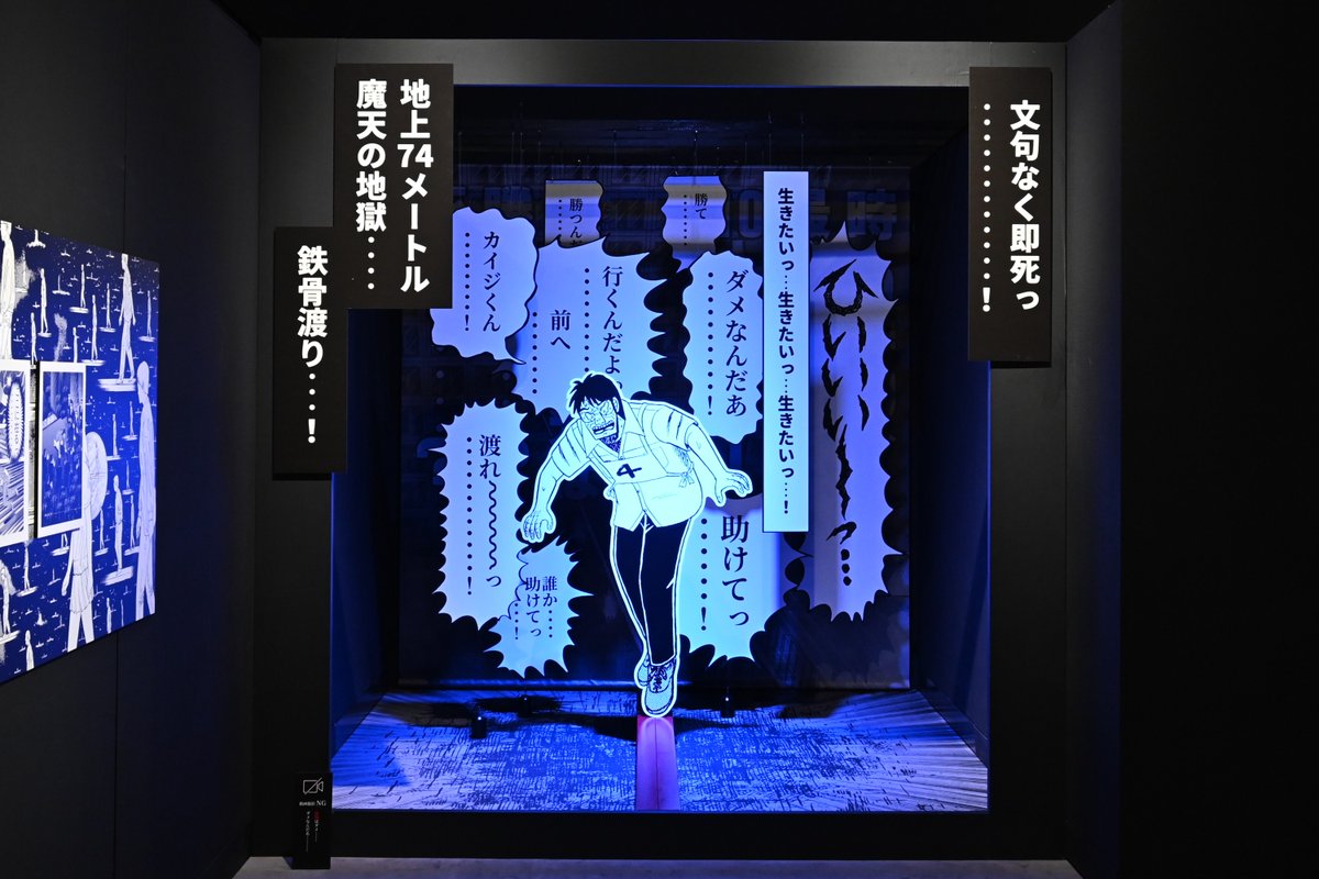 会場には原画のほか、名場面のパネルが展示され、「鉄骨渡り」や「焼き土下座」のシーンなど、世界観を体感できるフォトスポットも設置。内覧会で挨拶した福本さんは「土下座を楽しそうに体験しているのはすごく不思議な感じだが、カイジの世界を全身で楽しめる。皆さん、来てください」とアピールした。