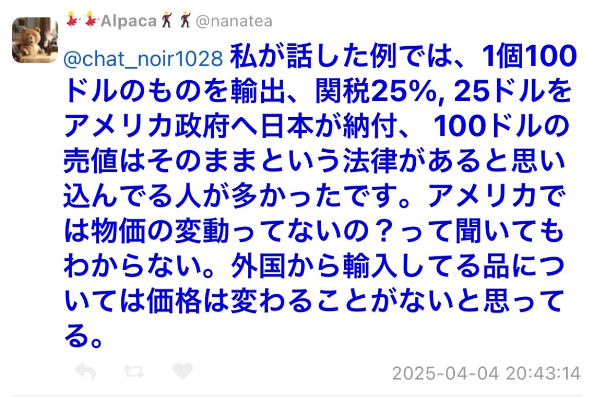 輸入品の値段にそのまま上乗せされるん? - 59 名前:一般よりも上級の名無しさん 投稿日時:2025/04/06(日) 18:34:44.25 ID:11UlAJB20