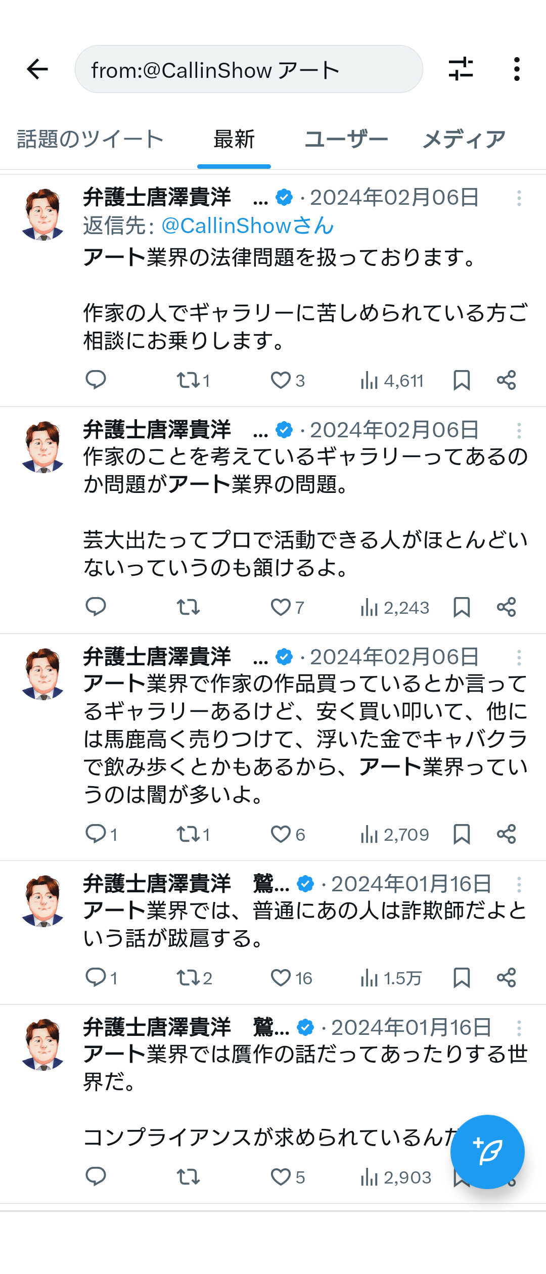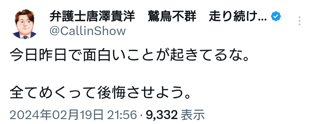 「唐澤弁護士は内容証明ではなく、突然SNSのダイレクトメッセージで『2週間以内に100万円を払え』という主旨の内容を送ってきたんですよ。これって半分恐喝じゃないですか。担当弁護士に相談したら、放っておきなさいと言われたので、放置しています。しかし、唐澤弁護士はTwitter上で、この件を煽るようなことを書き込んでいるので、それについては弁護士を通じて抗議しています。A子さんはもともと、えびはら先生の知人です。12月26日に、えびはら先生に相談した際、丸く収めますとおっしゃっていただいたのですが……」 - 21 名前:一般よりも上級の名無しさん 投稿日時:2025/04/07(月) 22:36:32.31 ID:iMT7fG2h0