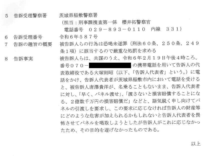 ところが、この北島代表ら3名を被告訴人に、昨年11月26日、茨城県警稲敷警察署は恐喝未遂容疑でのこの刑事告訴を正式に受理している。