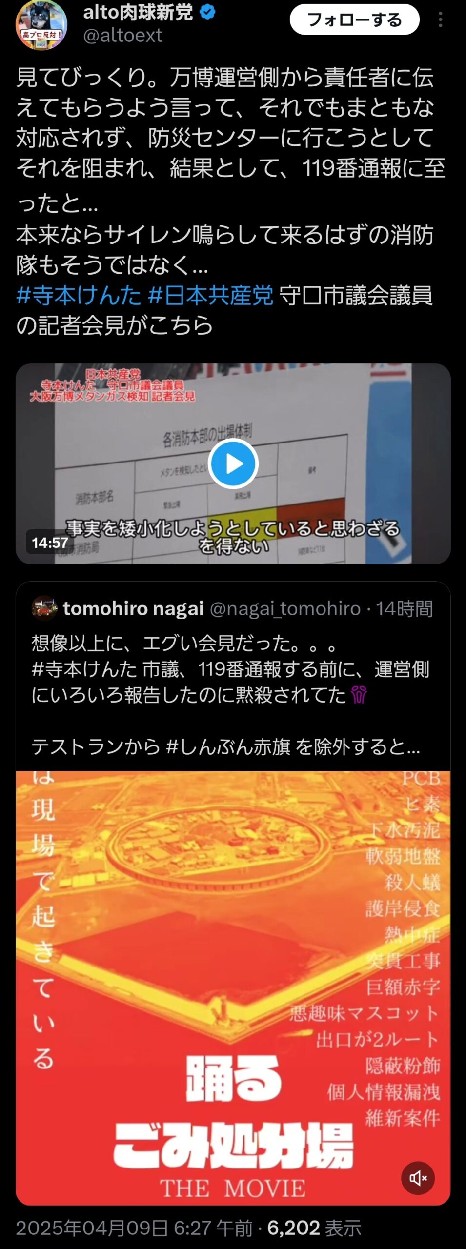 メタンガスを検出した市議、万博運営が黙殺しようとしたため、仕方なく119番していた😡輪を乱すな