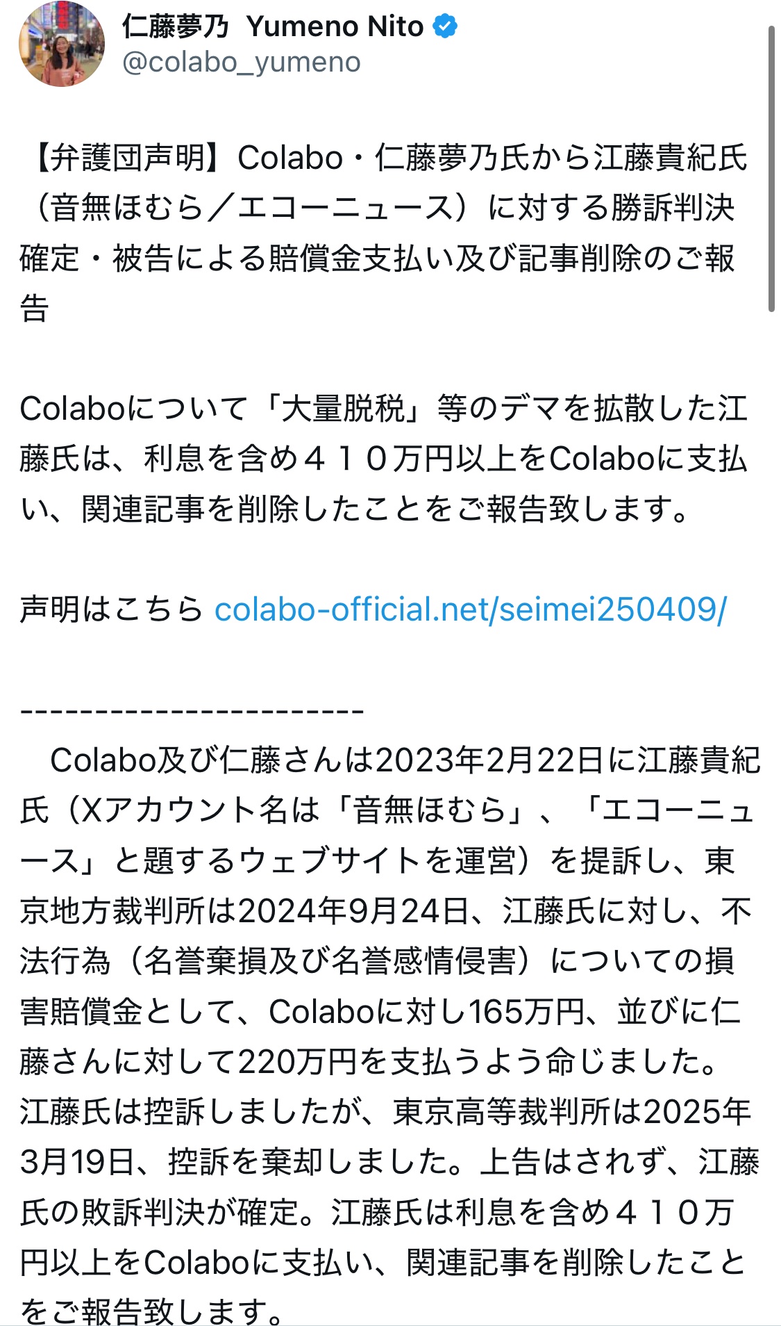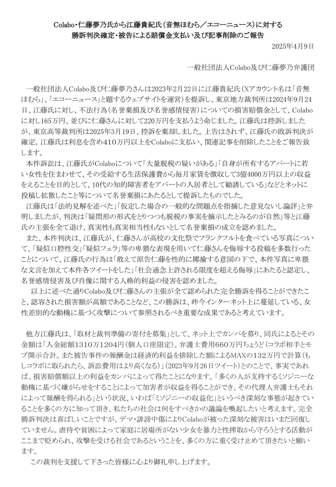 この額はColaboという団体相手+仁藤氏個人相手をあわせてだから