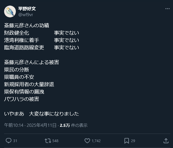 ヒラコー、兵庫県知事問題についに口を出してしまう