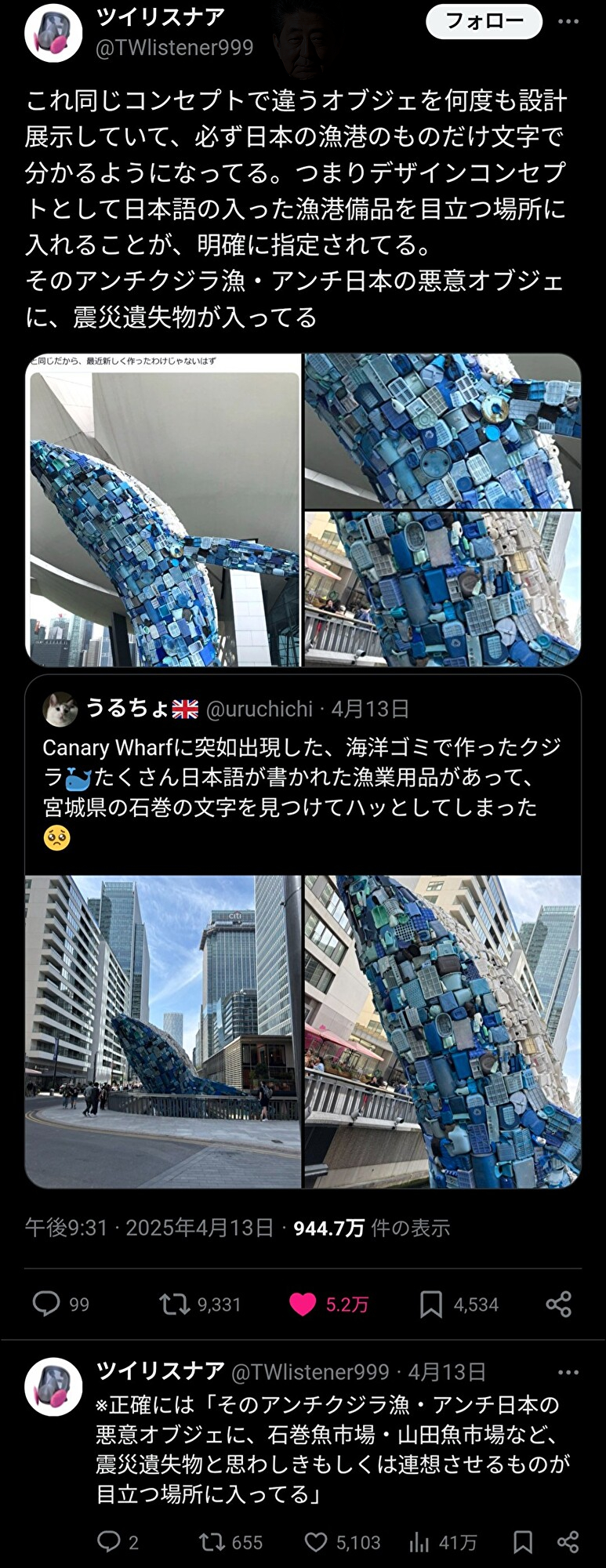 捕鯨に反対するオブジェなのは確かかもしれないが、日本全体への悪意だとか、頭の中で悪意を増幅して解釈するのも病んでると思う