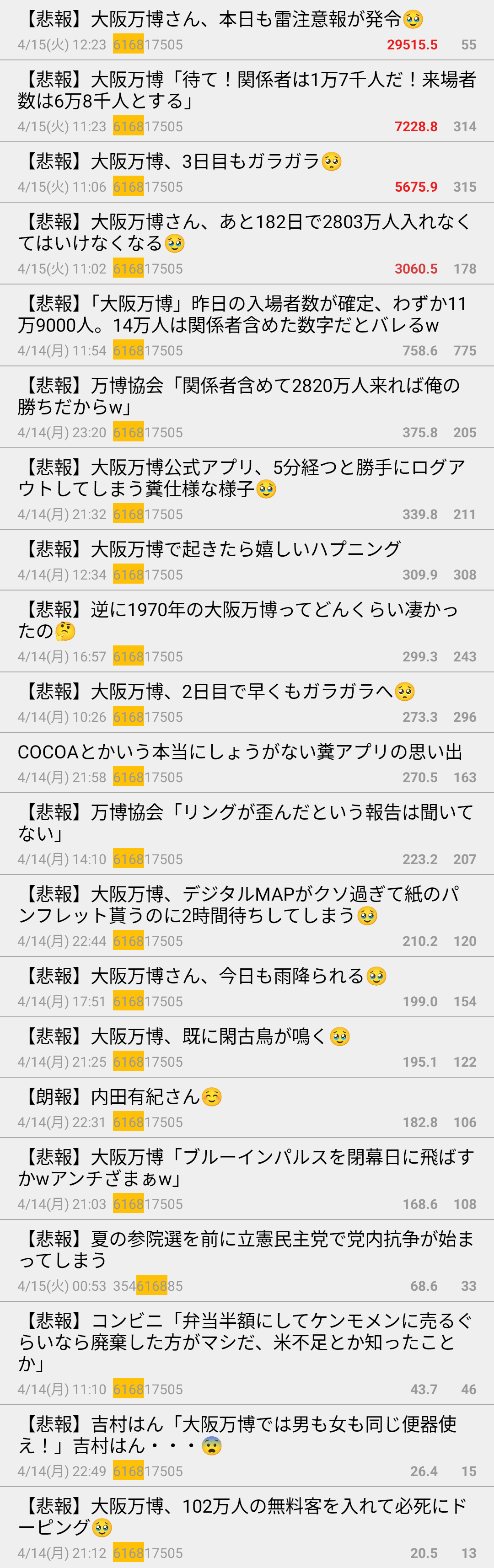 万博叩きスレが伸びるネタだから立ててるんだろうか - 44 名前:一般よりも上級の名無しさん 投稿日時:2025/04/15(火) 13:39:55.32 ID:Ce8ByW1U0