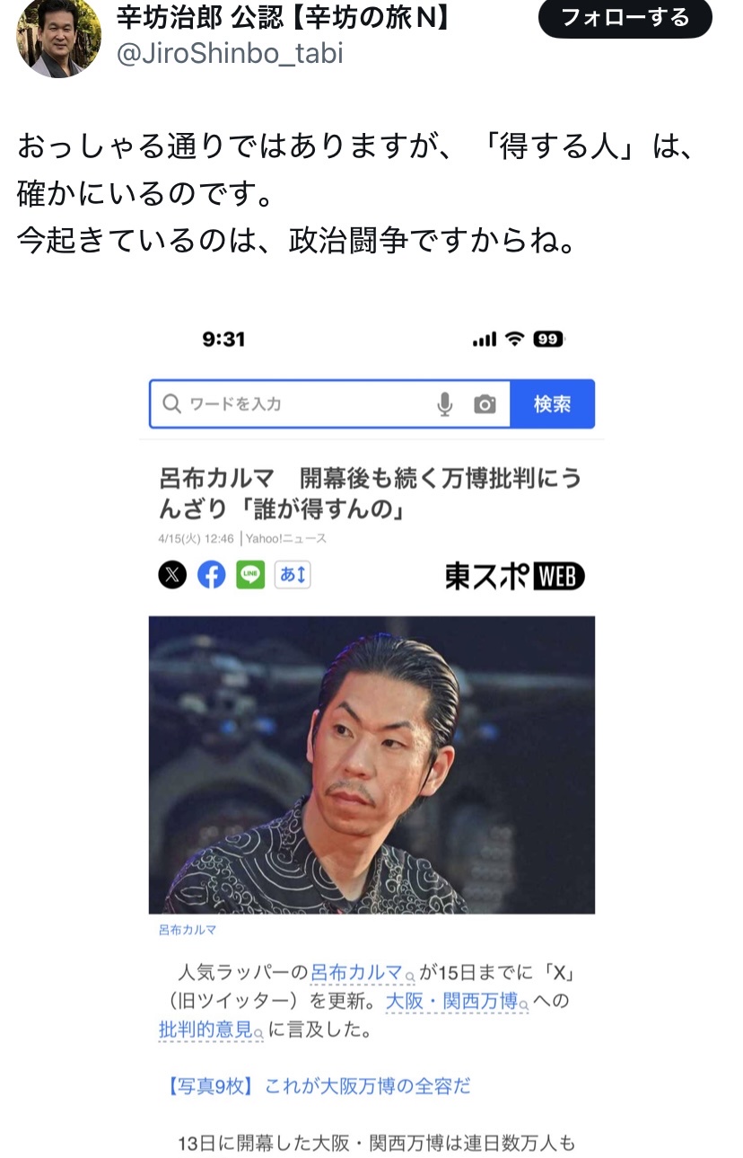 辛坊のこれはともかく、テレビで誰かが万博に肯定的な発言をしただけで誹謗中傷されるからな