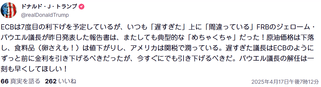 トランプ「ECBは利下げなのにパウエルはまた失敗だ!物価は下がりアメリカは関税で大儲け。なのに利下げはまだ?即刻クビ!