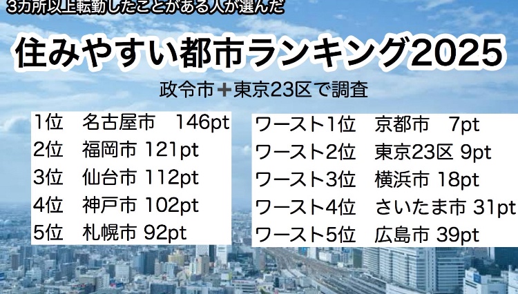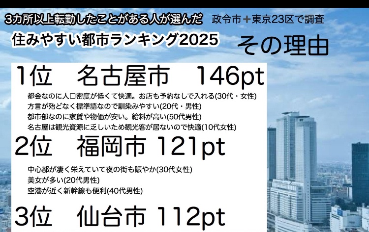 ワイも転勤族やけど名古屋が断トツで住みやすかった