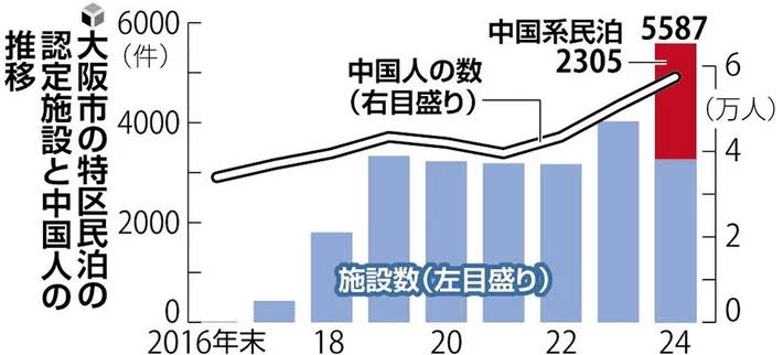 阪南大の松村嘉久教授(観光地理学)が、大阪市内の国家戦略特区制度に基づく「特区民泊」 5587件(2024年末時点)について調査したところ、41%にあたる2305件が、営業者または営業法人の代表者の名前が中国系だった。中国系の特区民泊はコロナ禍後に急増しており、その半数は2022年以降に市から認定を受けていた。