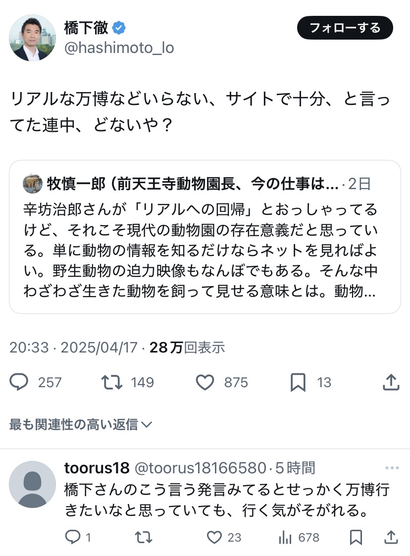 橋下徹「リアルな万博などいらない、サイトで十分、と言ってた連中、どないや?」