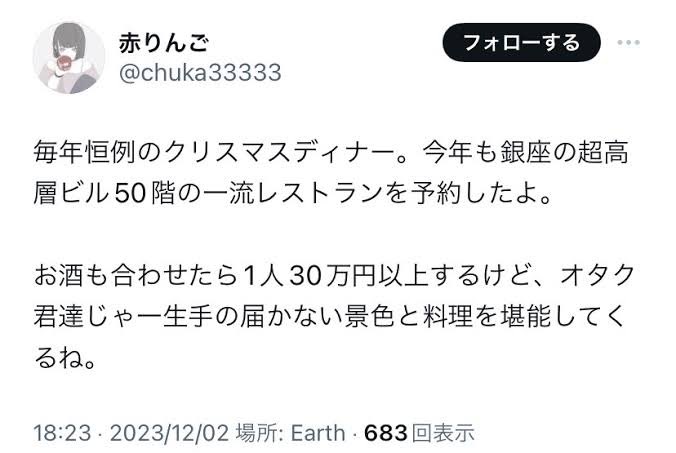 お酒も合わせたら1人30万円以上するけど、オタク君達じゃ一生手の届かない景色と料理を堪能してくるね。」