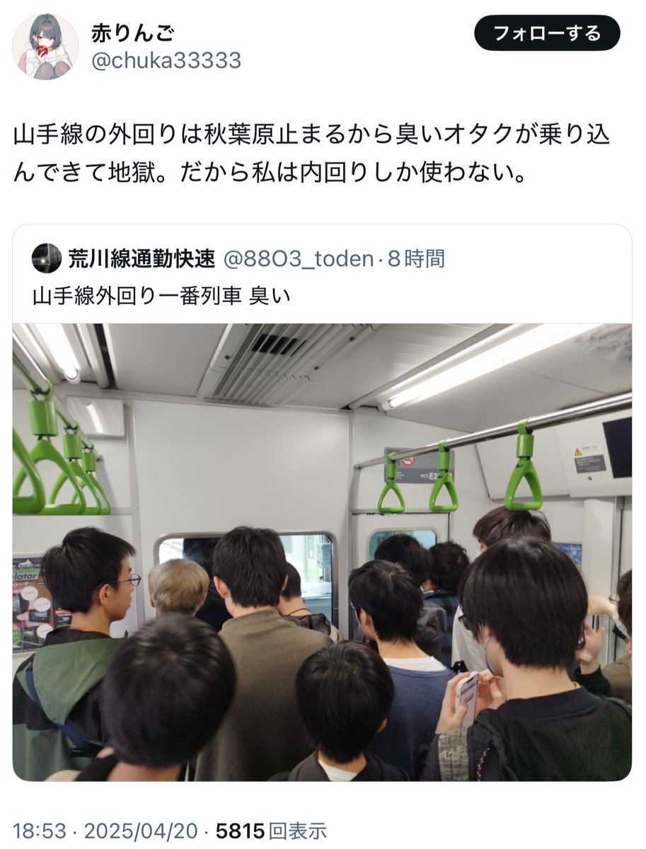フェミ女「山手線の外回りは秋葉原止まるから臭いオタクが乗り込んできて地獄。だから私は内回りしか使わない」「内回りでも止まるだろ」