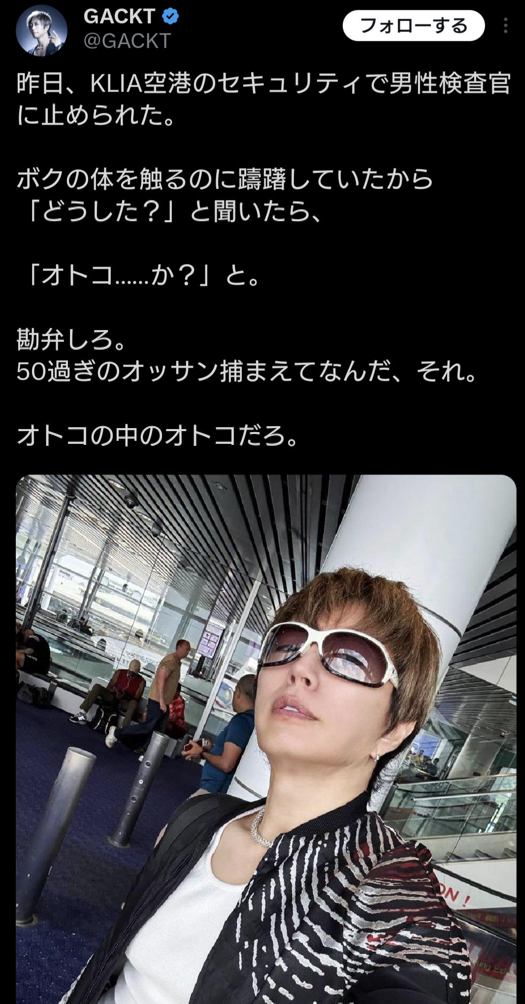これGackt的には「50過ぎたオッサンだけどまだまだ中性的な魅力のある俺」みたいな自虐風自慢のつもりだろうけど普通に危機感を持った方がいい