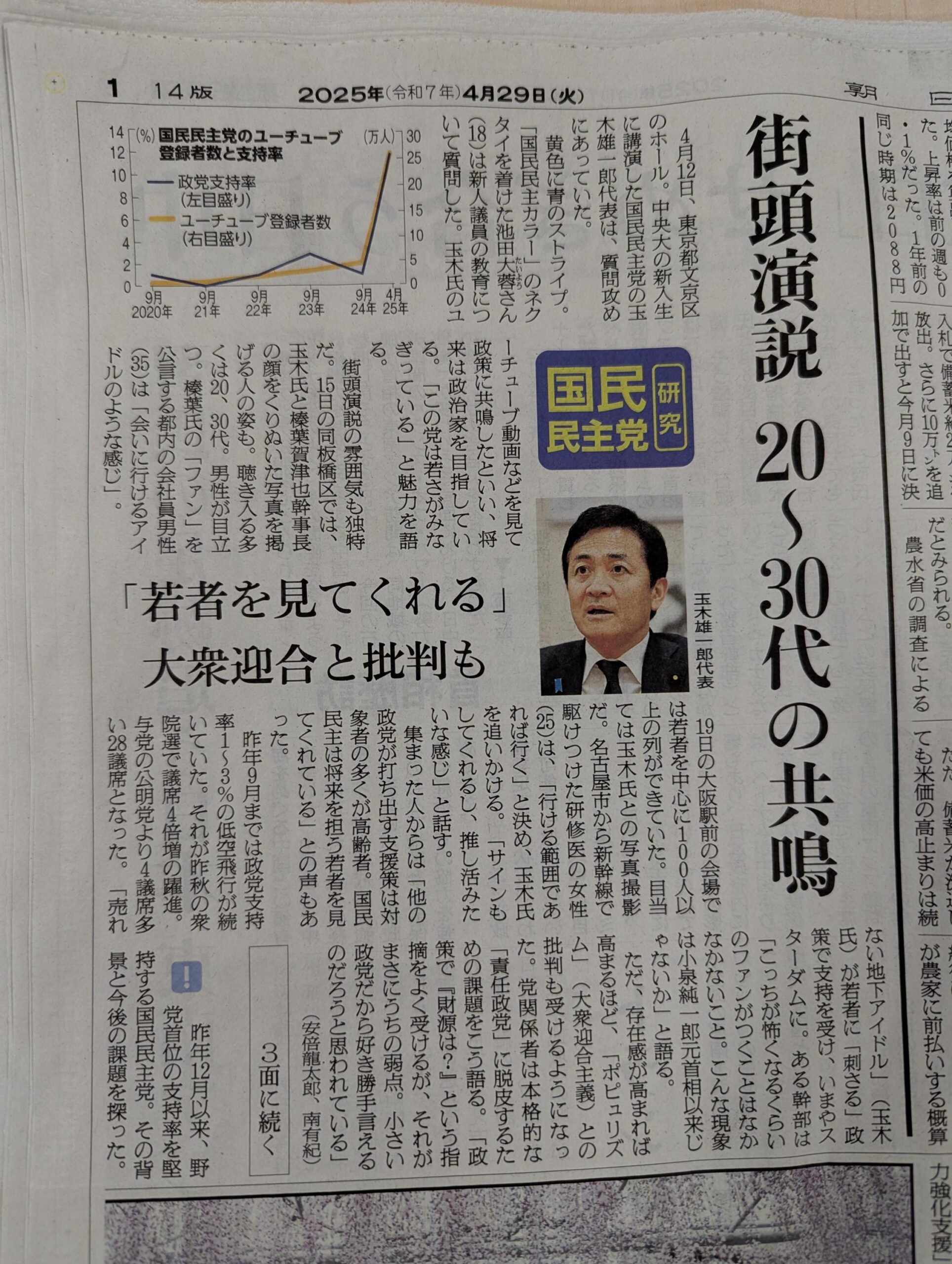 今日の朝日新聞朝刊の一面に国民民主党特集、Z世代や氷河期世代が共鳴