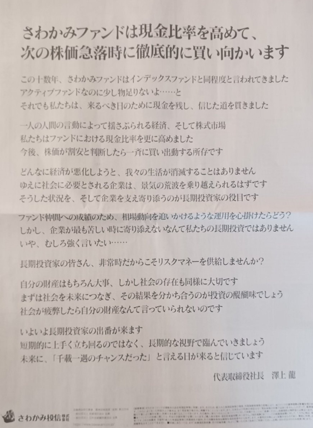 さわかみ投信が新聞1面広告「次の暴落で徹底的に買う」