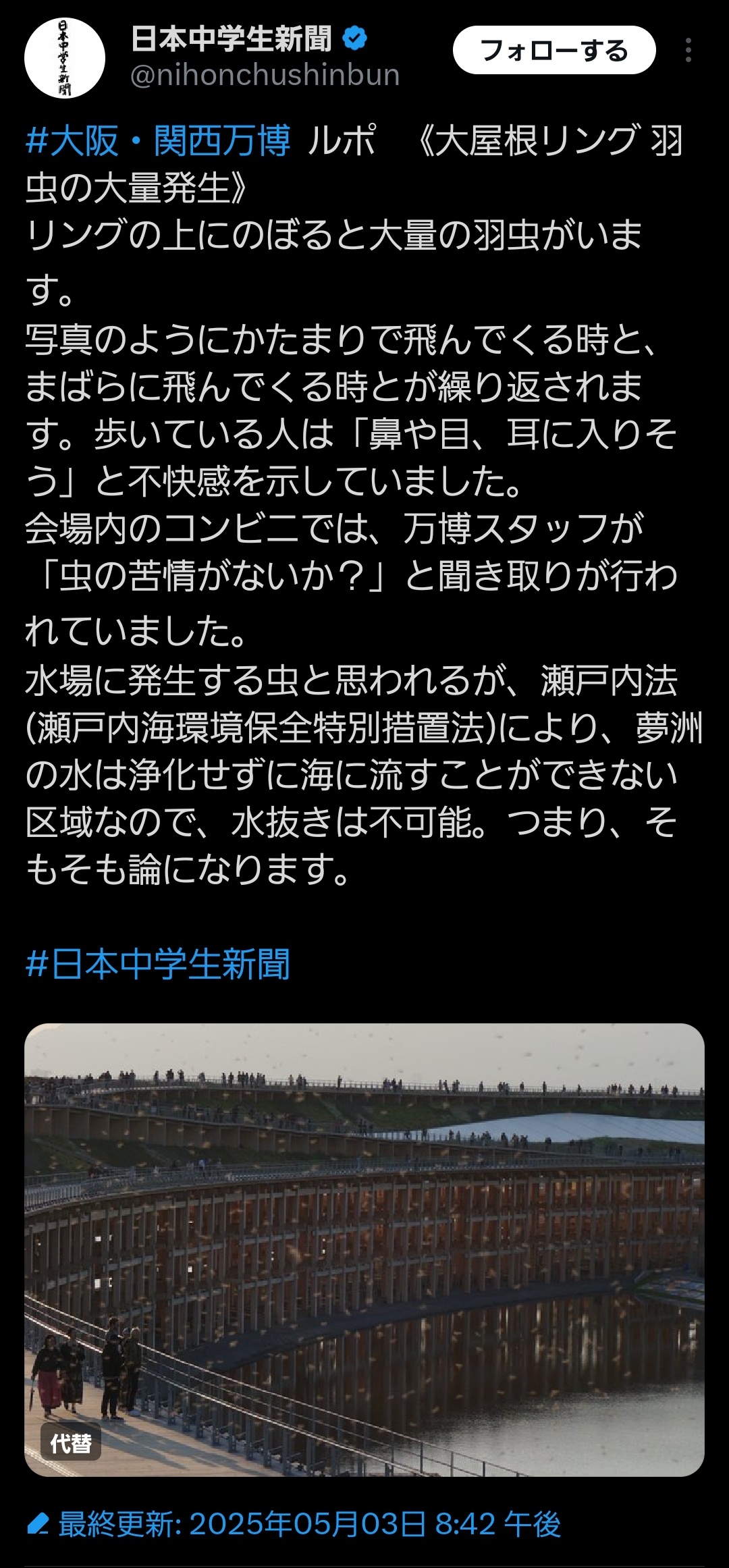 大成功してる万博に対して虫を理由に批判するのは雑魚すぎ - 16 名前:一般よりも上級の名無しさん 投稿日時:2025/05/04(日) 13:24:15.71 ID:8Cbl7guw0